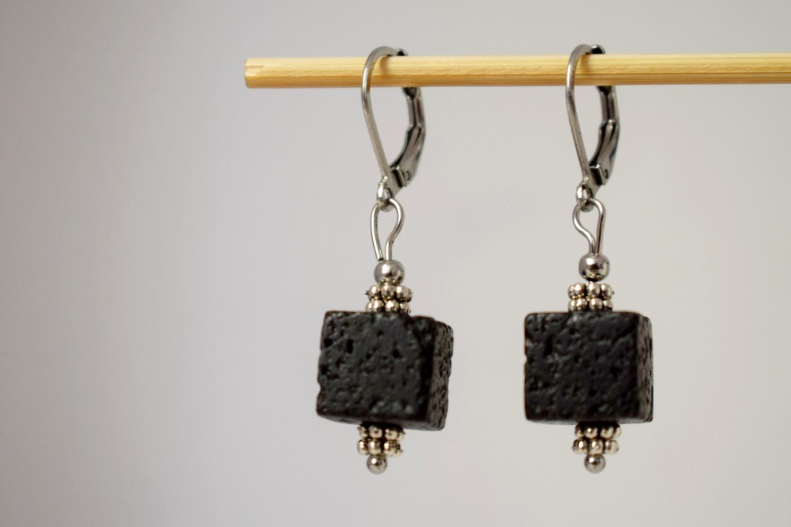 Würfelförmige Lavastein-Ohrringe, Creolen mit schwarzen Edelsteinperlen, Lavastein, Diffusor-Schmuck, chirurgischer Edelstahl, ätherisches Öl, Geschenk