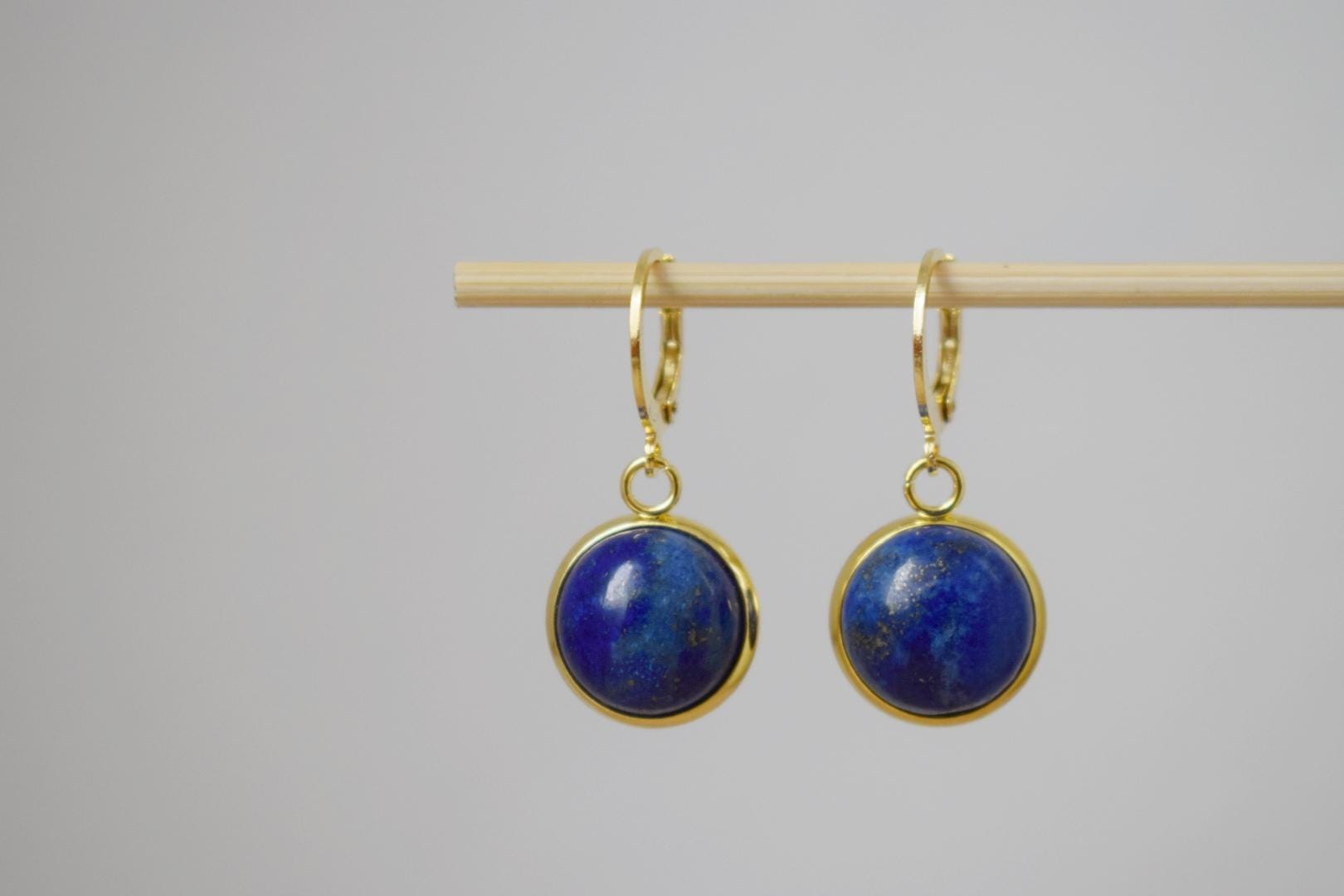 Lapis Lazuli Ears Dangle, Huggie Blue Lapis Hanging Ears, 24k Gold Plated, Round, 12mm, September Birthstone Jewelry, Gift for her