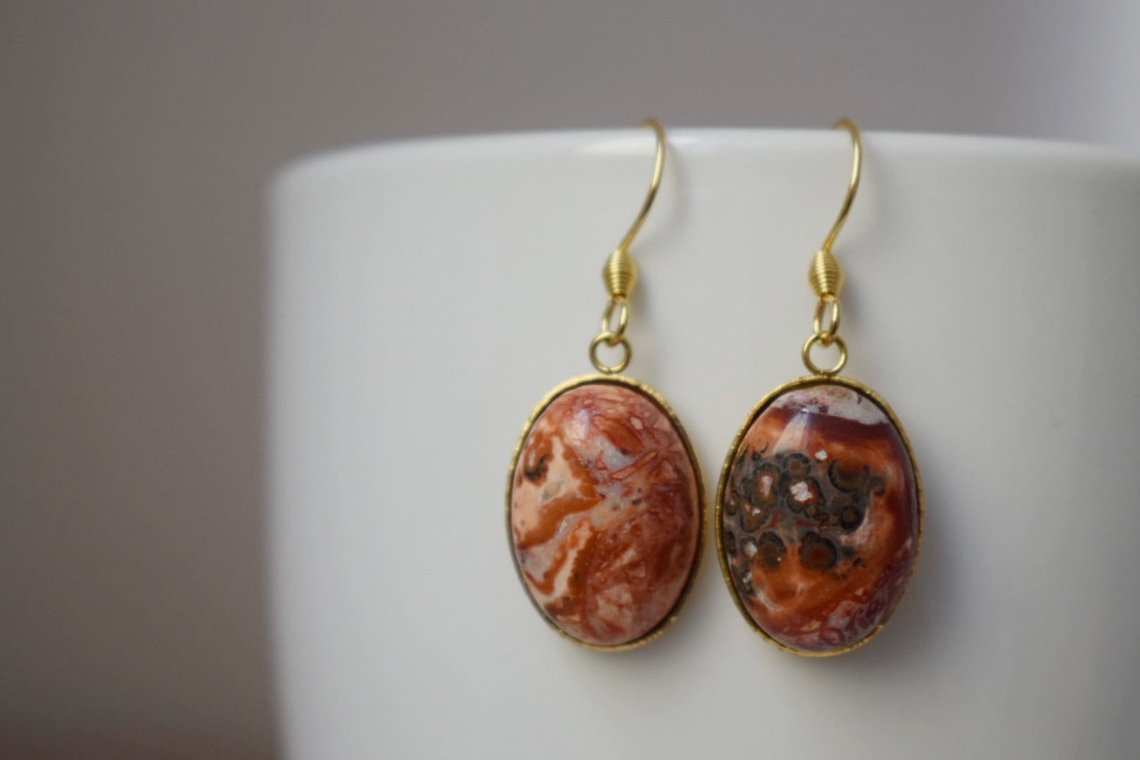 Leopard Skin Jasper Earrings Dangle, Oval Gemstone, Hanging earrings with stones, Gold Plated Stainless steel, Jasper jewelry, Gift for her