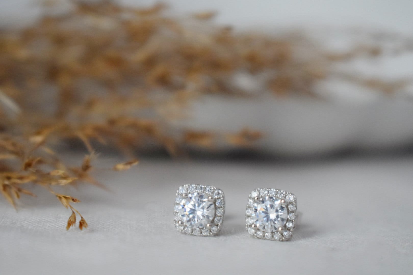 Sterling Silver Square Stud Earrings With CZ, Crystal square studs, Small 925 silver earrings, Minimalist, Push back studs, Gift for her