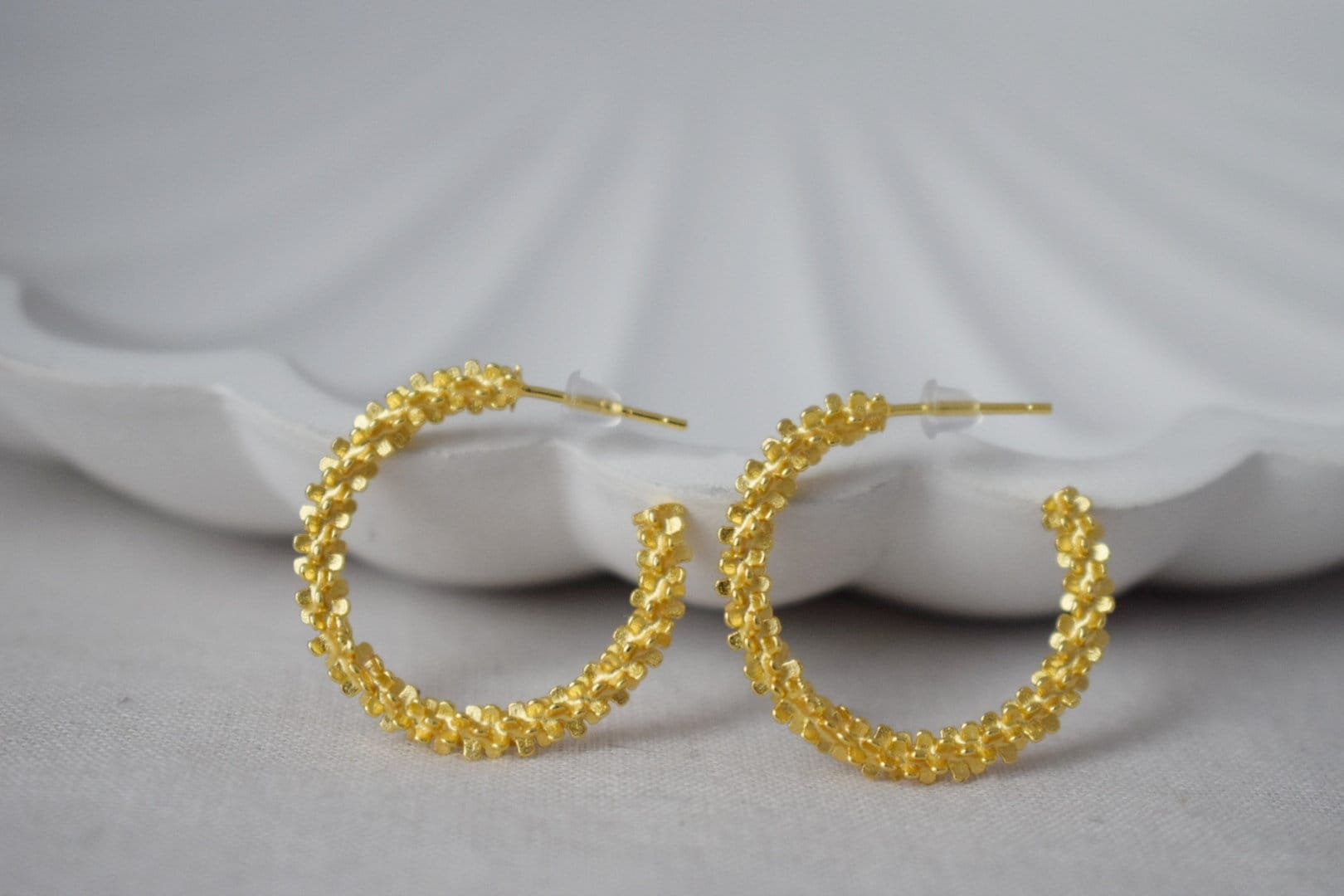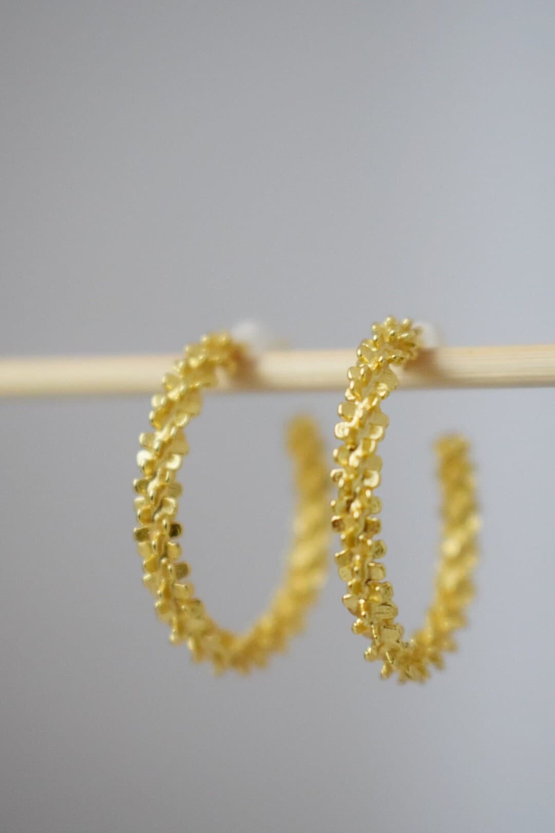 925 Sterling Silver Textured Hoop Earrings, Statement Golden Hoops, Half Modern Stud Earrings, C shape, Push Back, Perfect Gift for Her