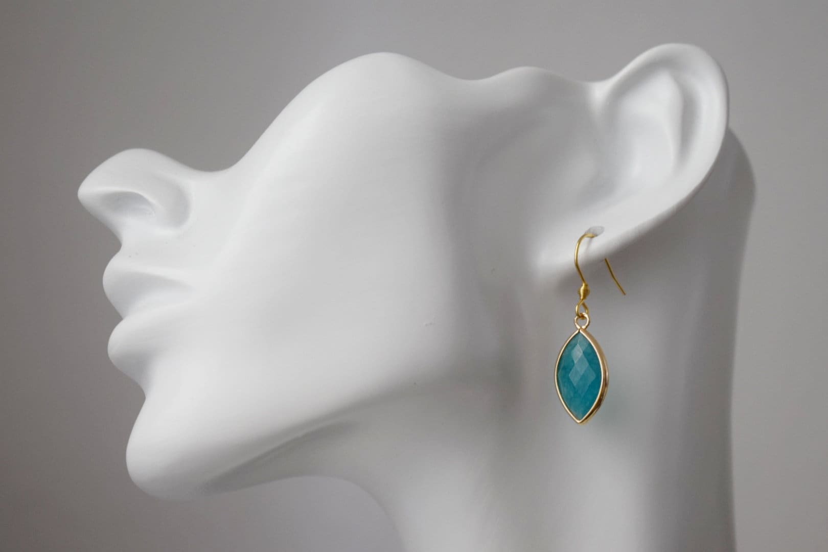 Aquamarine jade earrings, Faceted gemstone earrings, Blue gold dangle earrings, Horse eye, Stone hanging earrings, Jade gold jewelry gift