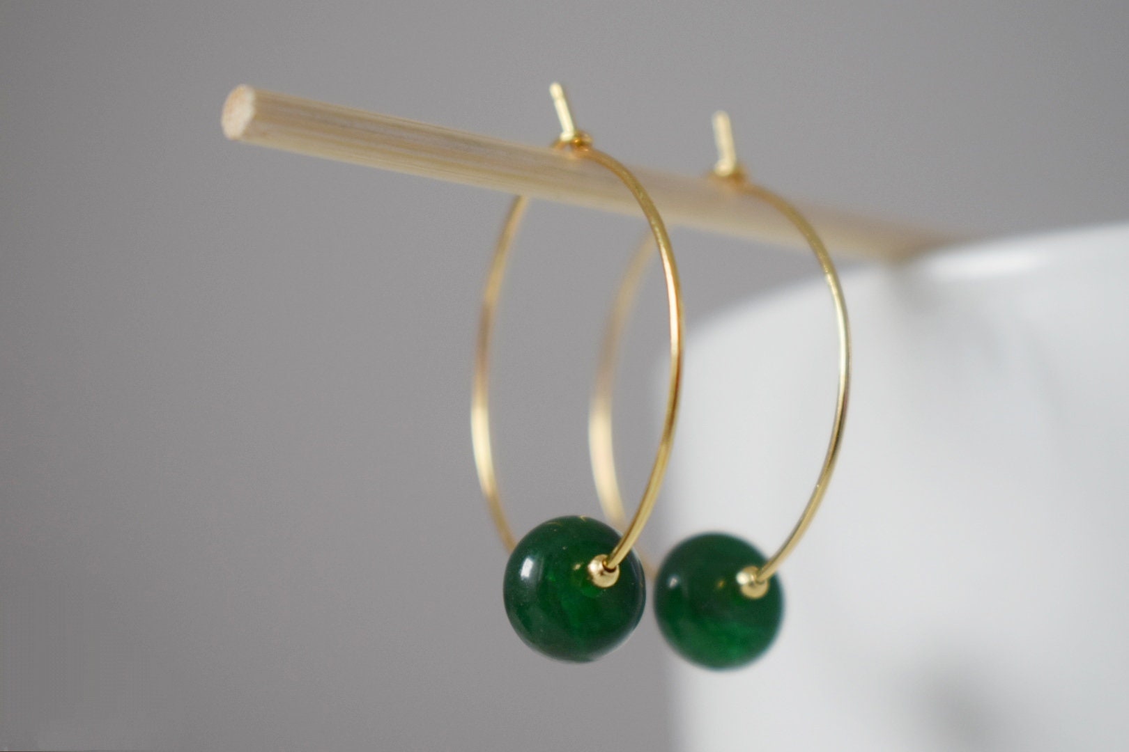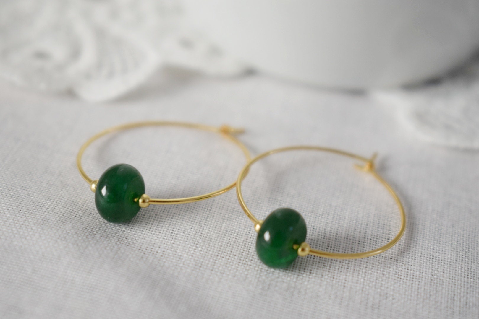 Dark green jade hoop earrings, Gemstone Creole, 18k gold plated stainless steel, Emerald green, Minimalist, Boho handmade jewelry gift