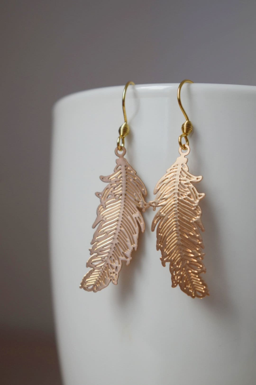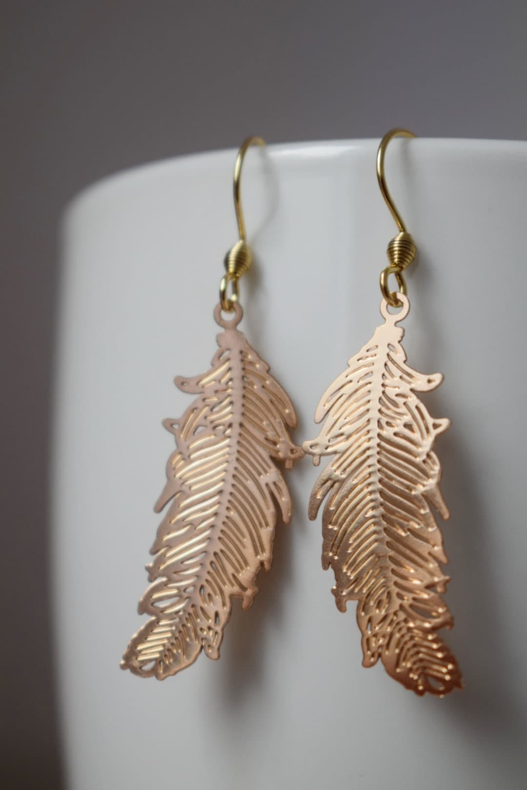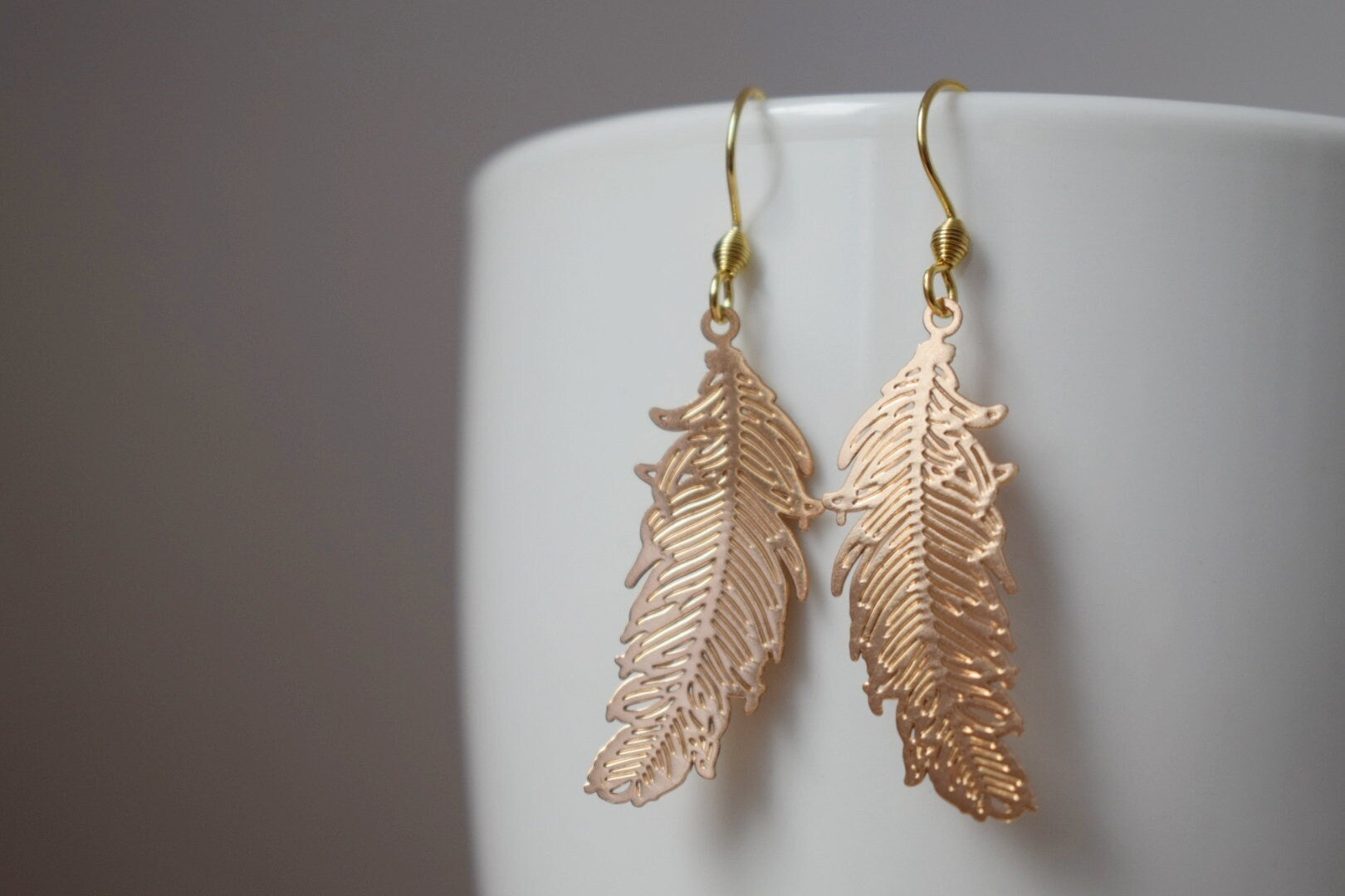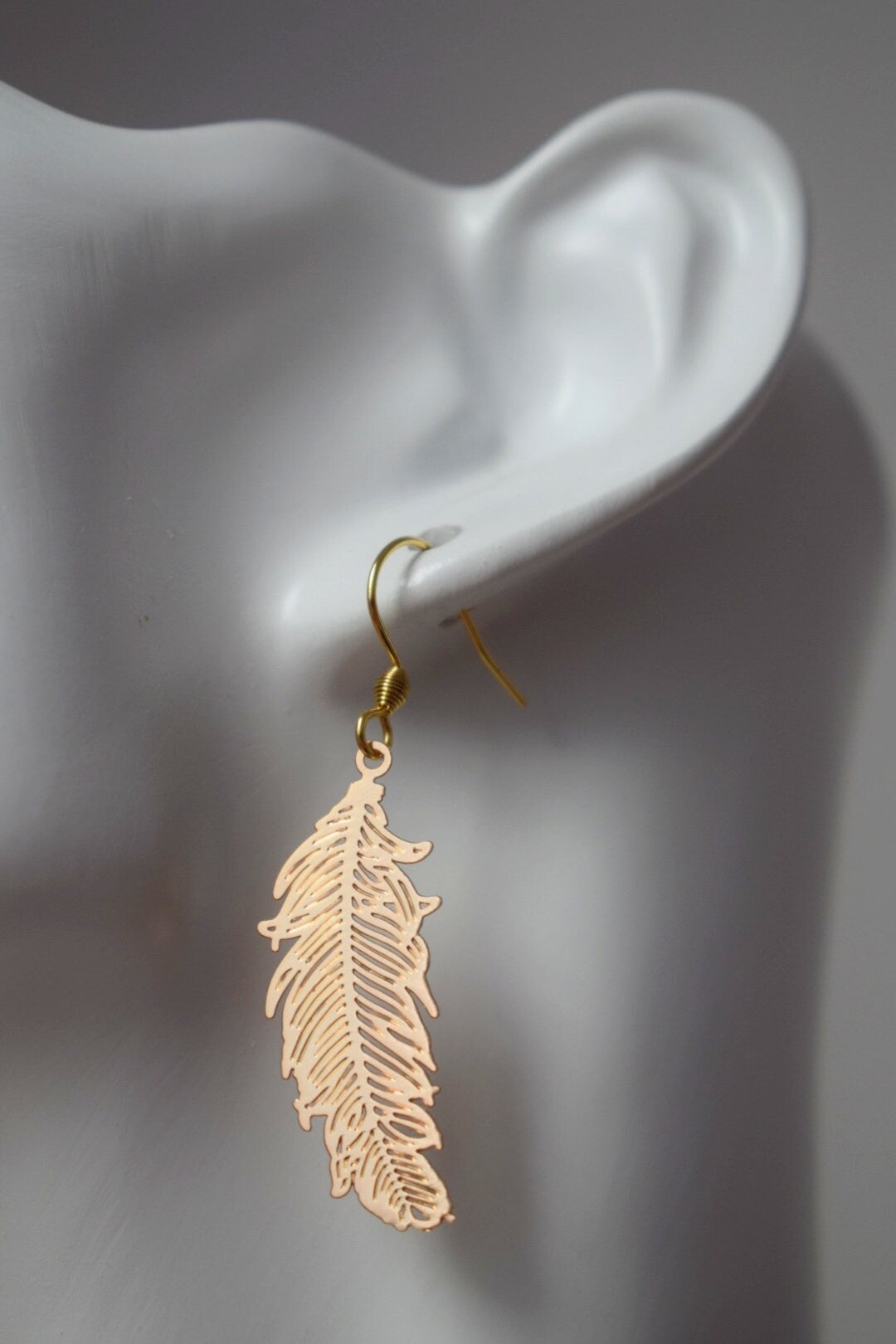 Feather gold earrings for women, 18k gold plated stainless steel ear hooks, Boho filigree gold earrings, Feather jewelry, Gift for her