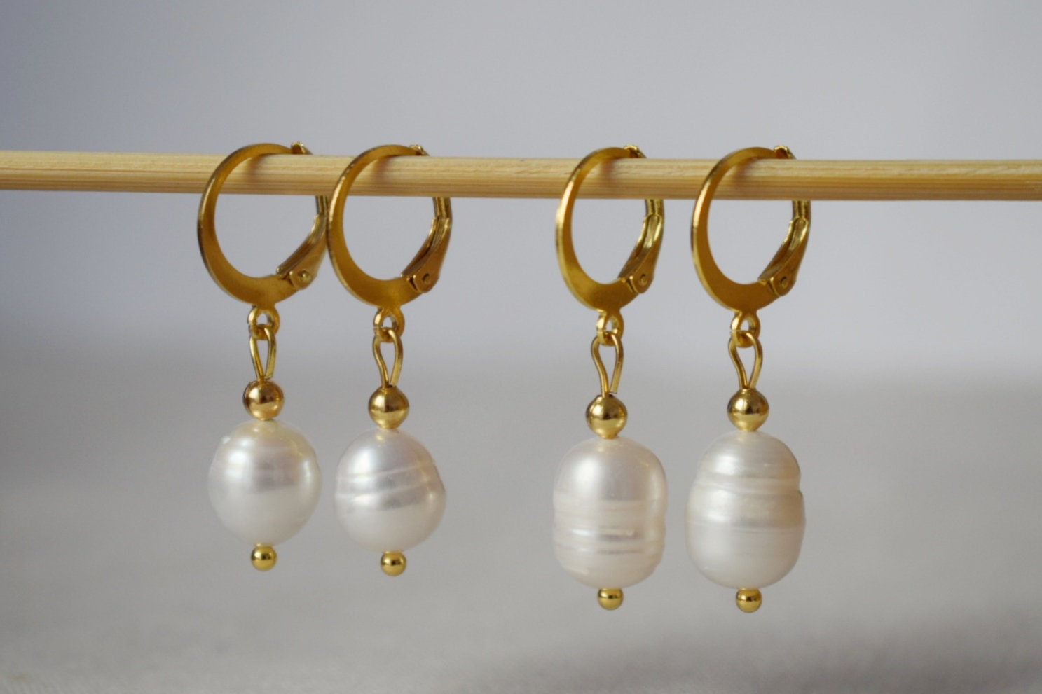 Freshwater pearl huggies earrings, 24k Gold plated stainless steel hoops, Simple elegant drop earrings, Lightweight, Minimalist jewelry