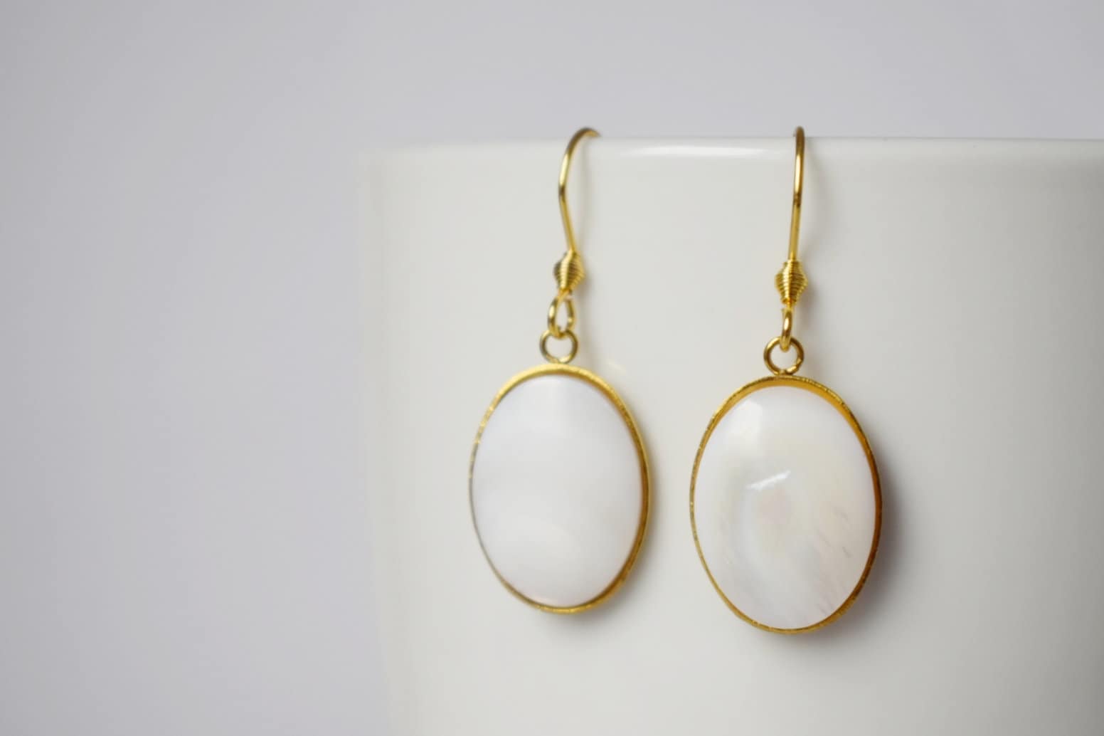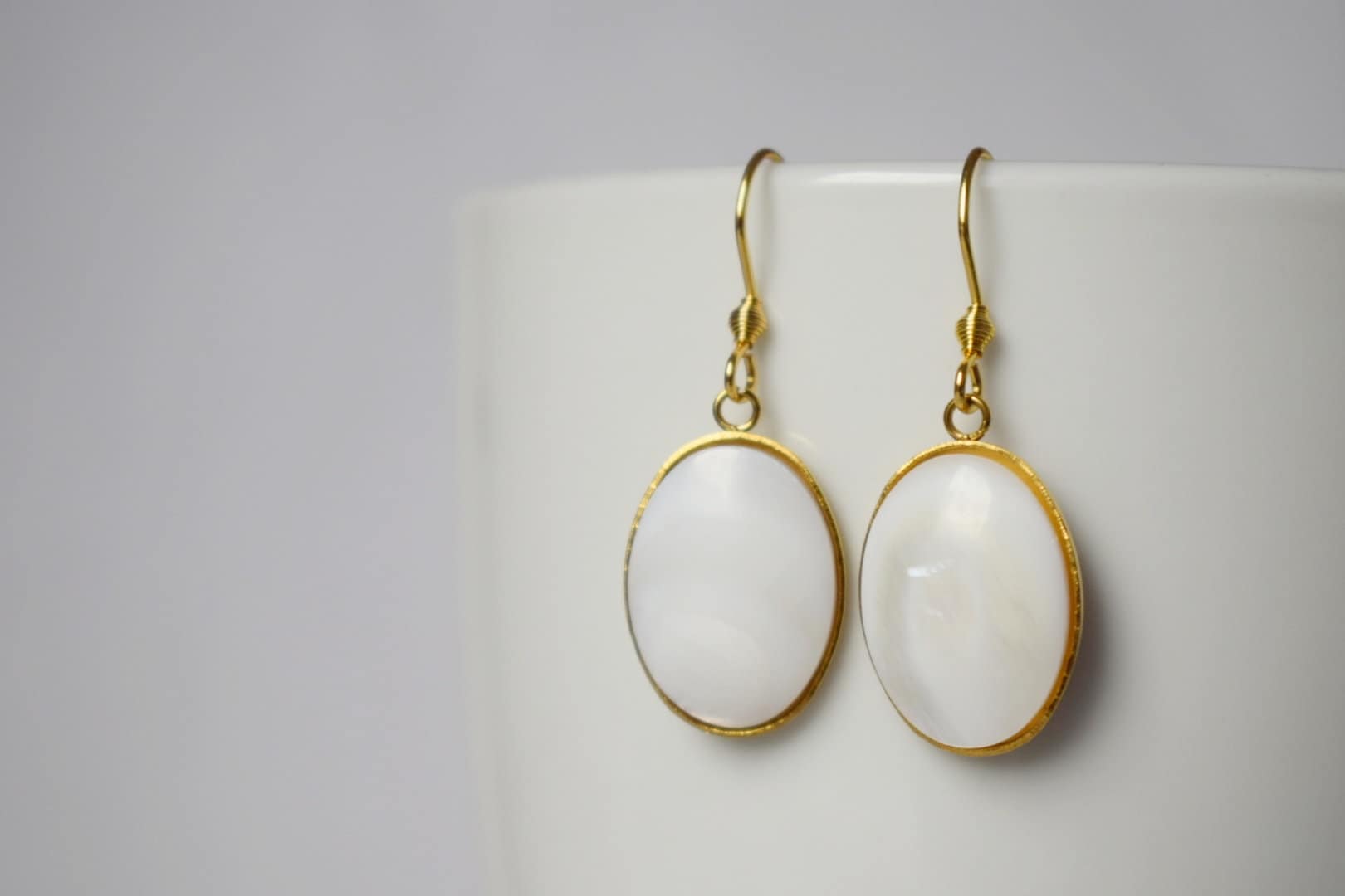 Freshwater shell gold earrings, Pearl gold earrings, Oval pendant dangle earrings, Bridesmaid, Wedding jewelry, Handmade gift for her