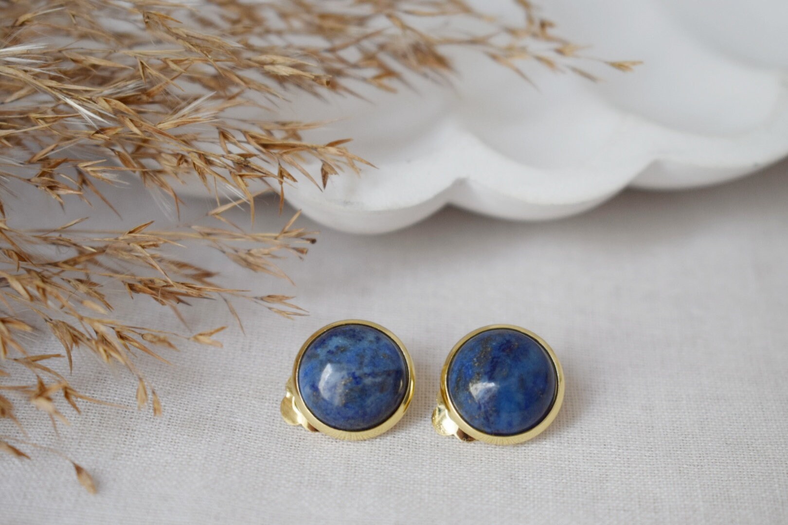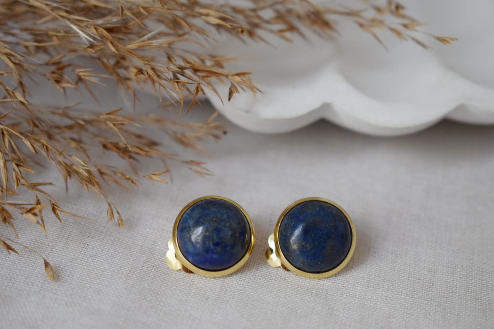 Gold clip on ears lapis lazuli, Clip on ears blue gemstone, Stainless steel, Round ear clips for women, Non pierced ears