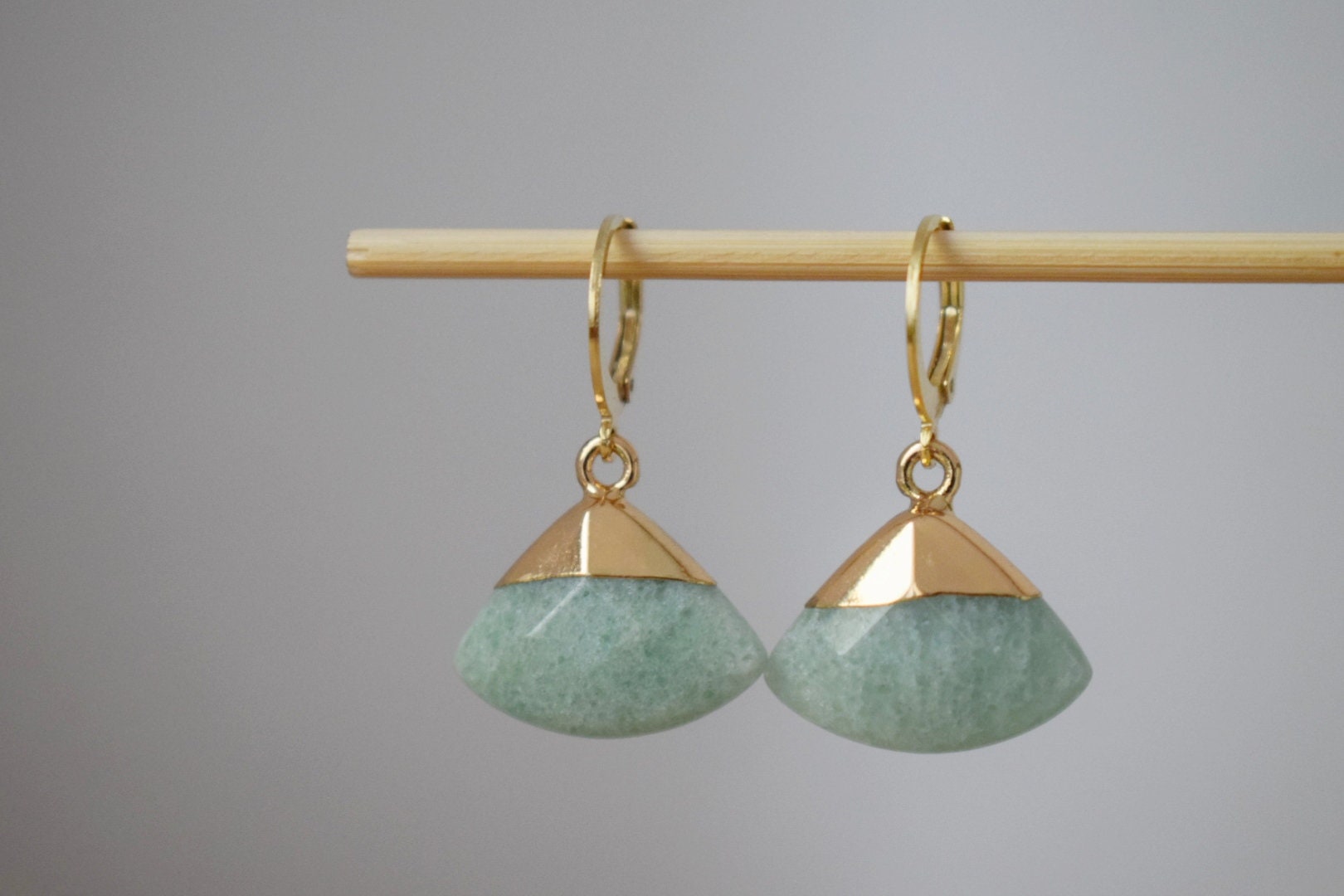 Gold plated huggie earrings with aventurine pendant, Dangle stone earrings, Green triangle drop earrings, Fan earrings, Jewelry gift for her