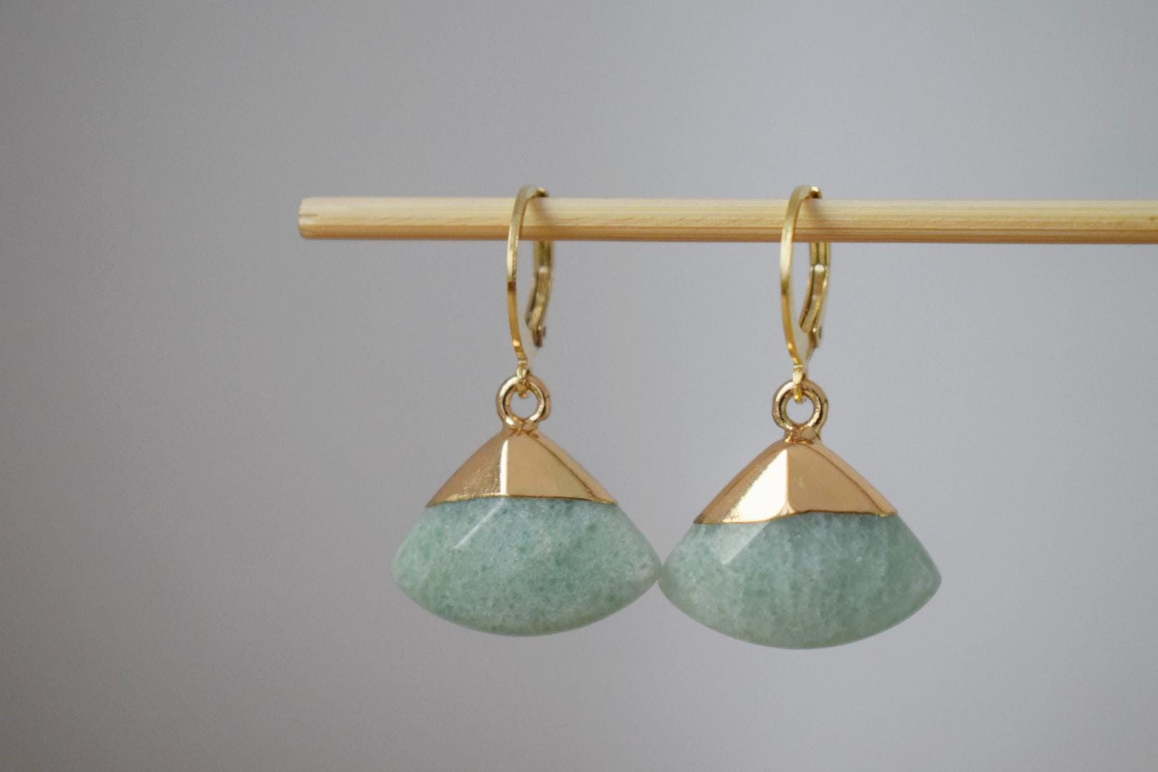 Gold plated huggie ears with aventurine pendant, Dangle stone ears, Green triangle drop ears, Fan ears, Jewelry gift for her