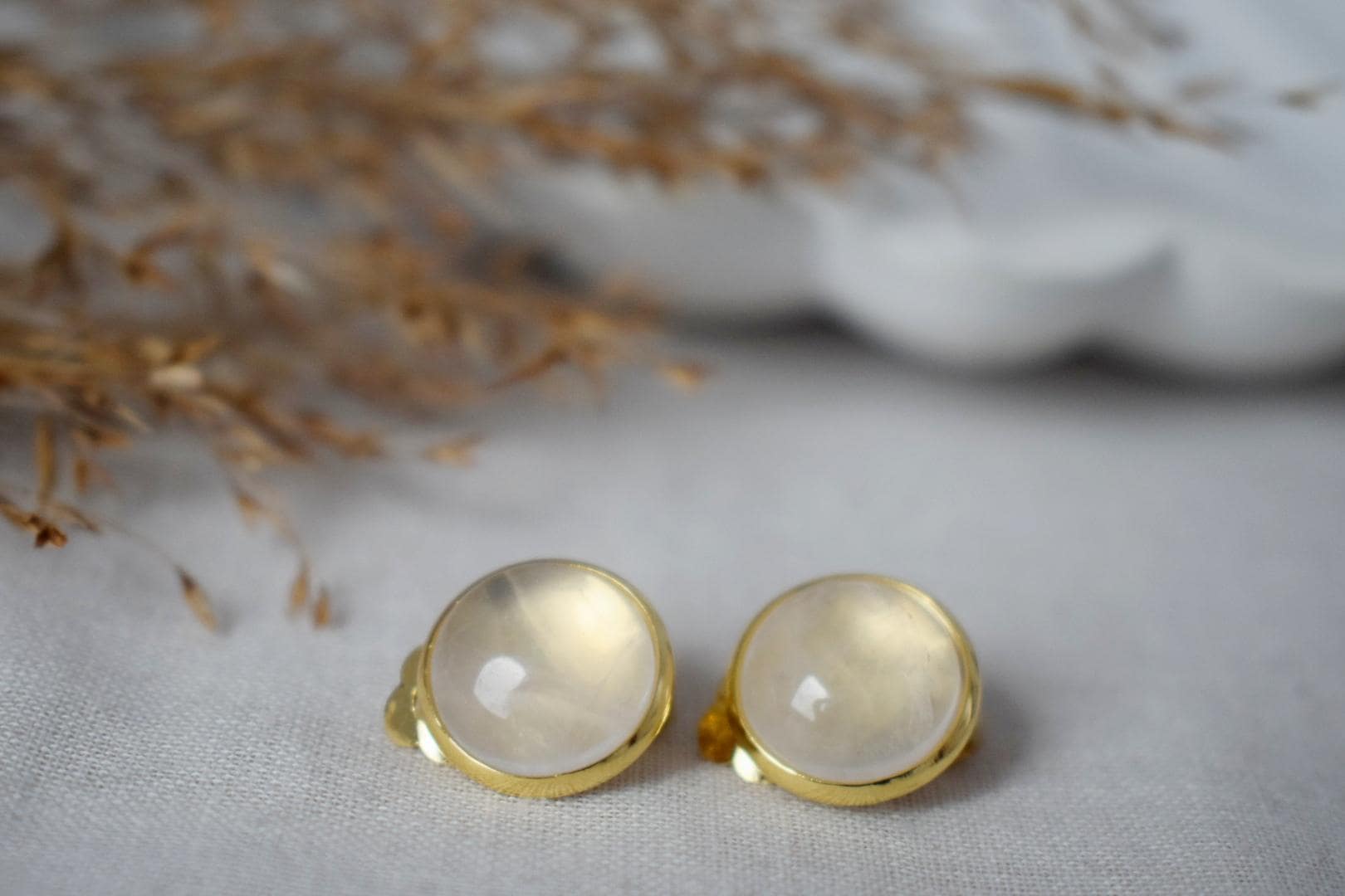 Golden clip on earrings with quartz, 12mm round gemstone, Non pierced earrings, Stainless steel jewelry, No hole earrings, Handmade gift
