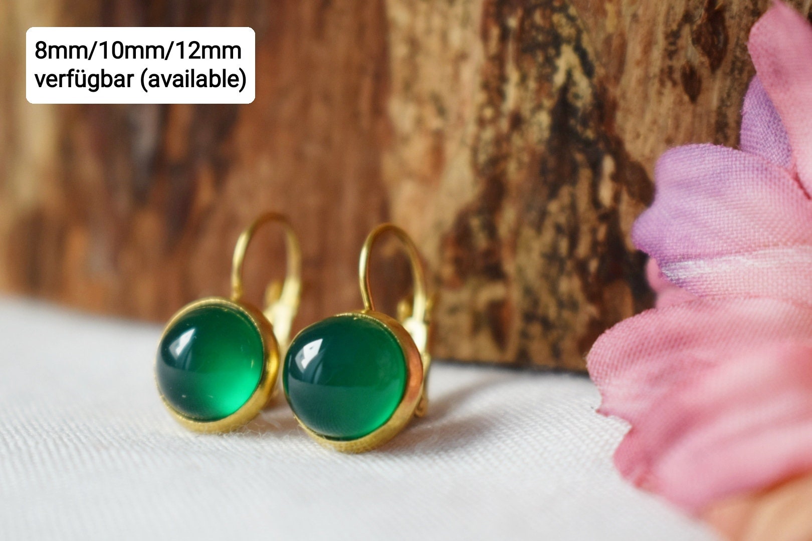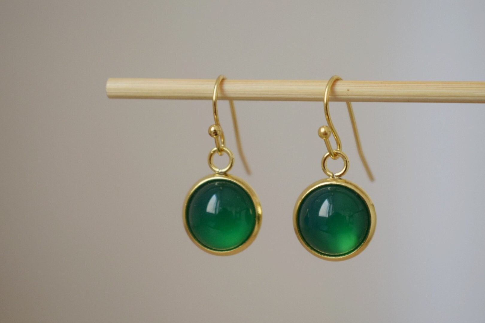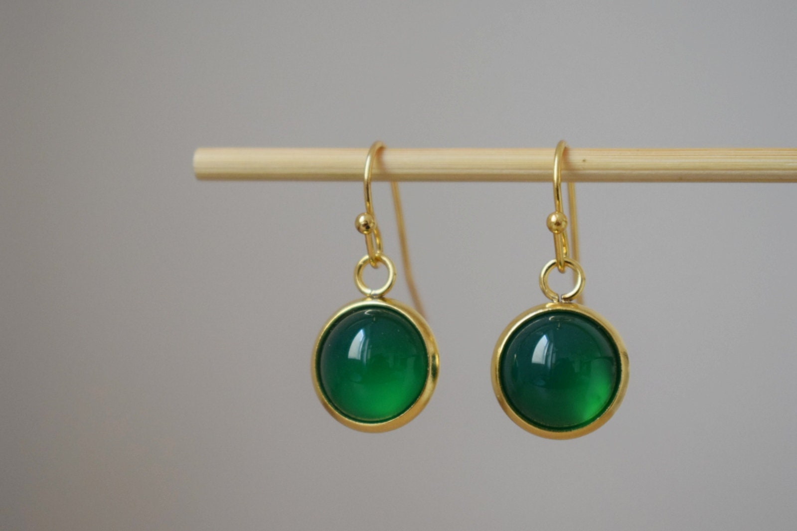 Green agate earrings, Small gemstone dangle earrings, Round 24k gold plated stainless steel pendant huggies, Minimalist jewelry gift for her