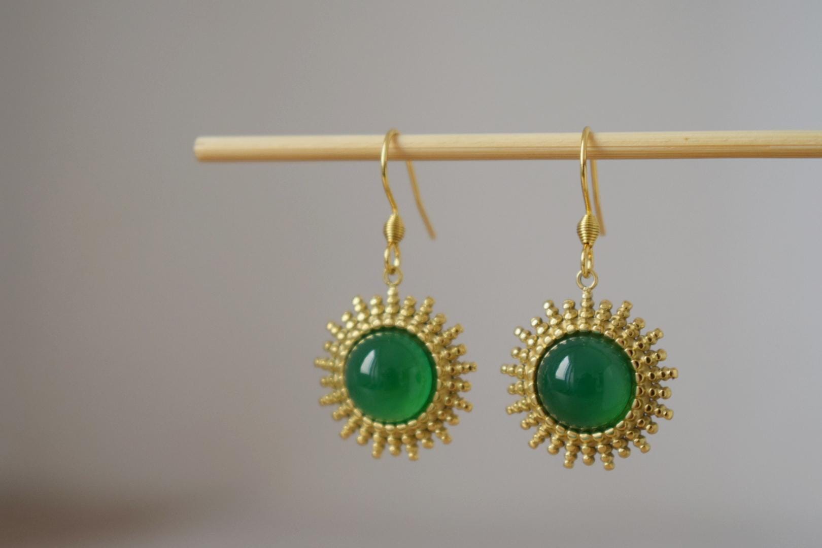 Green agate earrings, Sun rays dangling earrings, Sunburst, Gemstone earrings, Celestial jewelry, Gift for her