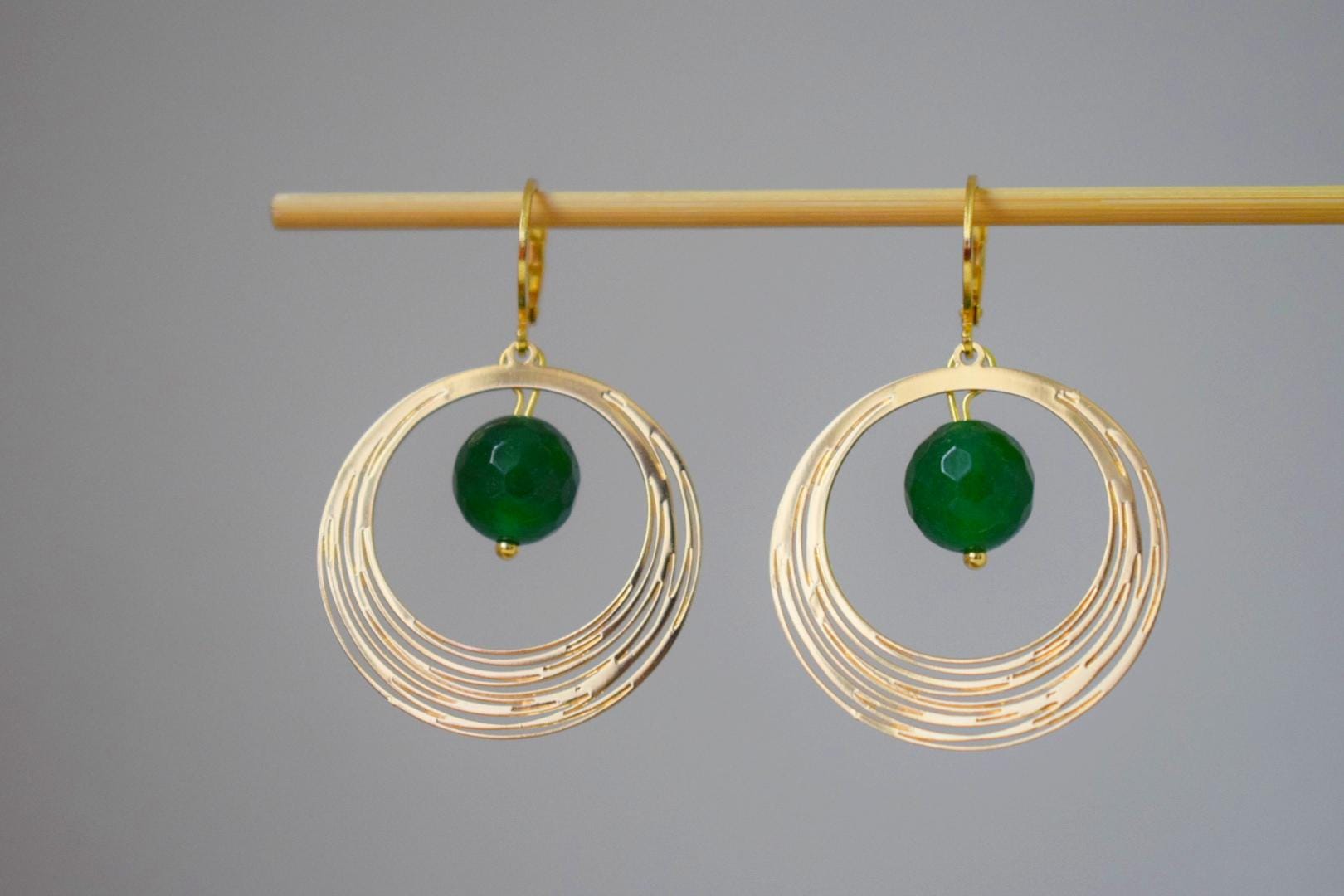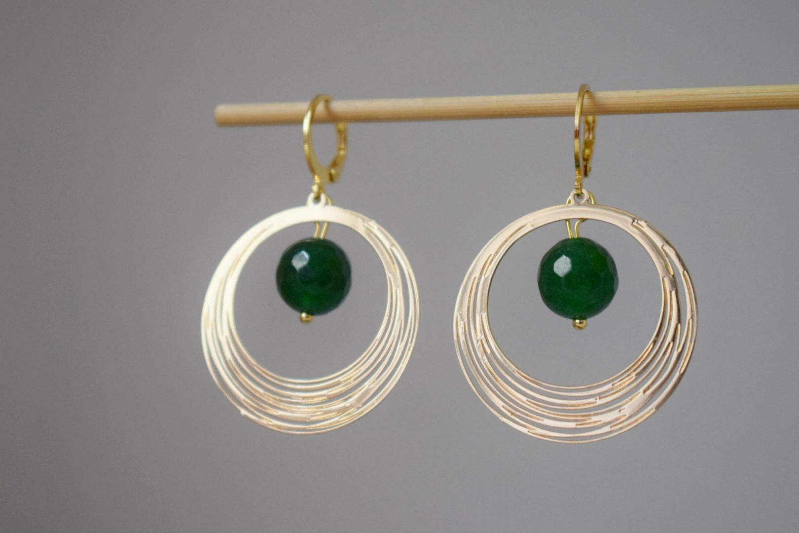 Green Jade Earrings, Gemstone Faceted Ball Hoops, Golden Circle Pendant Dangle Earrings, Minimalist Art Deco Jewelry, Handmade Gift for her