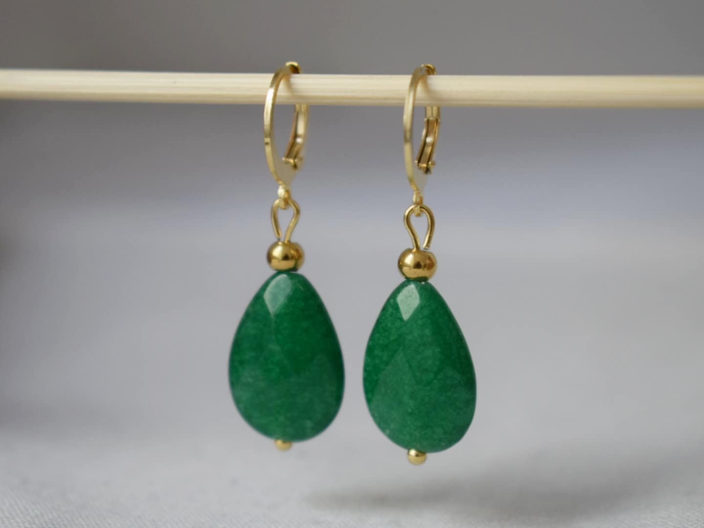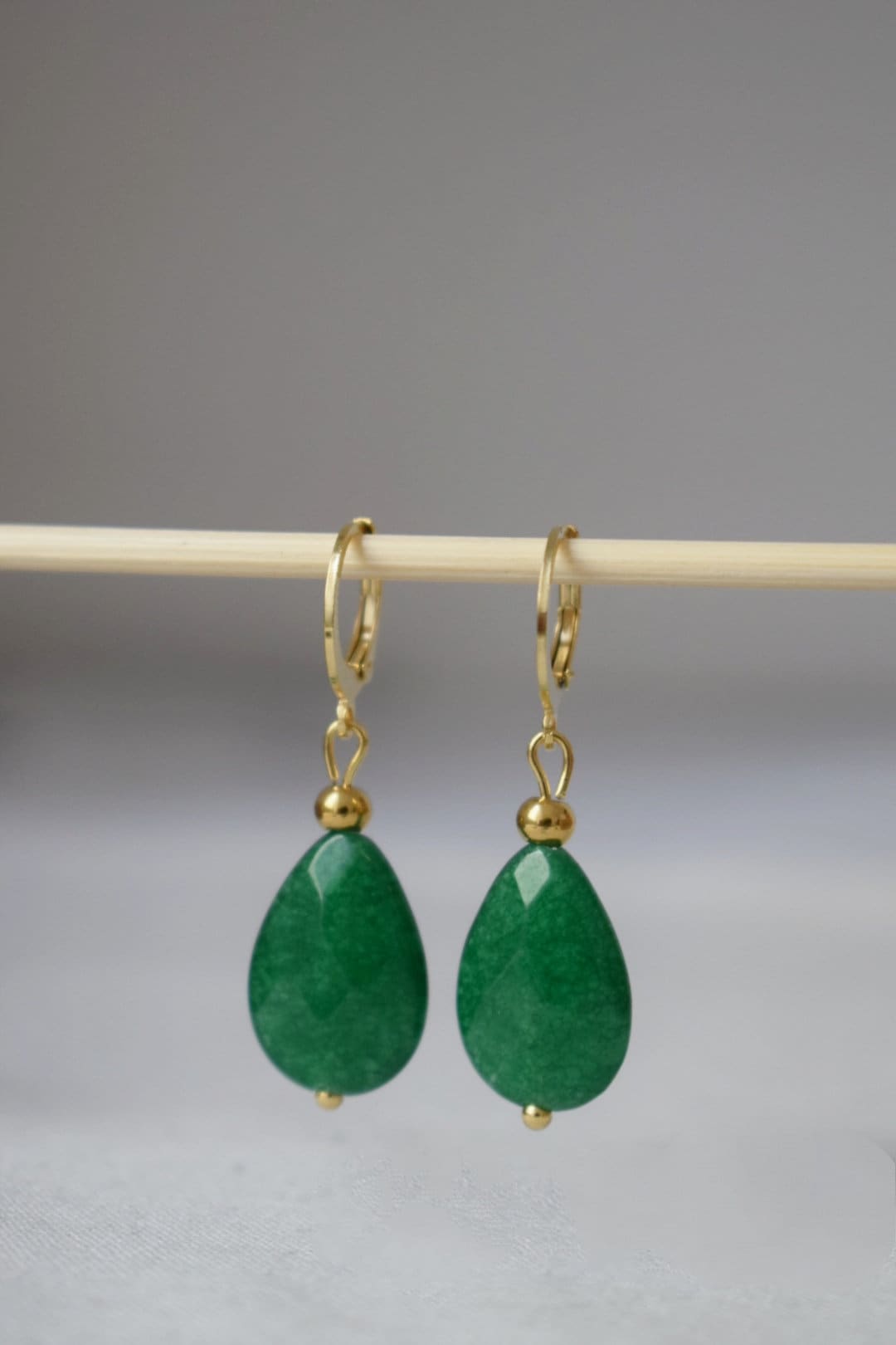 Green jade earrings gold, Teardrop dangling earrings, Green faceted gemstone drop huggies, Stone hoops, Green jade jewelry, Gift for her