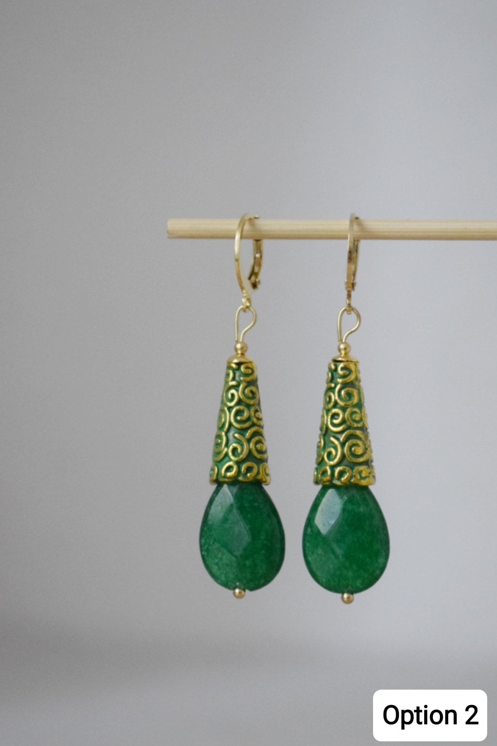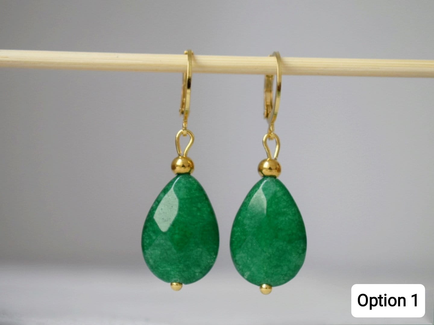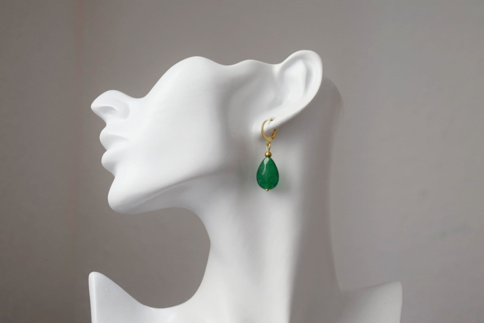 Green jade ears gold, Teardrop dangling ears, Green faceted gemstone drop huggies, Stone hoops, Green jade jewelry, Gift for her