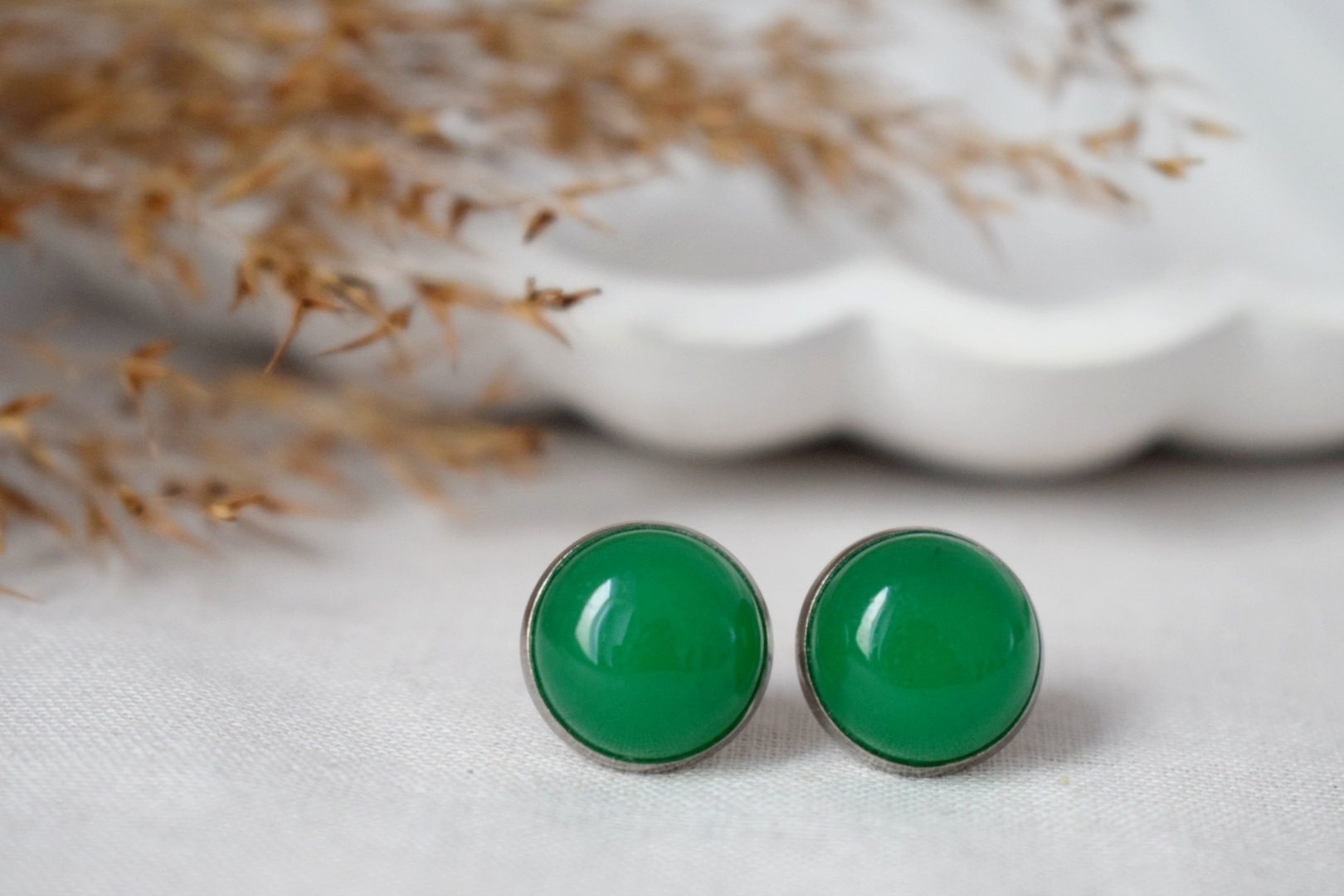 Green Jade Stud Earrings, 12mm Round Gemstone Studs, Stainless Steel Push Beck Earrings, Jewelry Gift, Mother's day gift