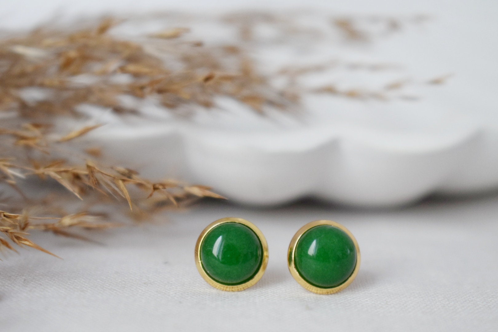 Green Jade Stud Earrings, 8mm Minimalist Gemstone Earrings, 18k Gold Plated Jewelry, Birthday Anniversary Gift For Her