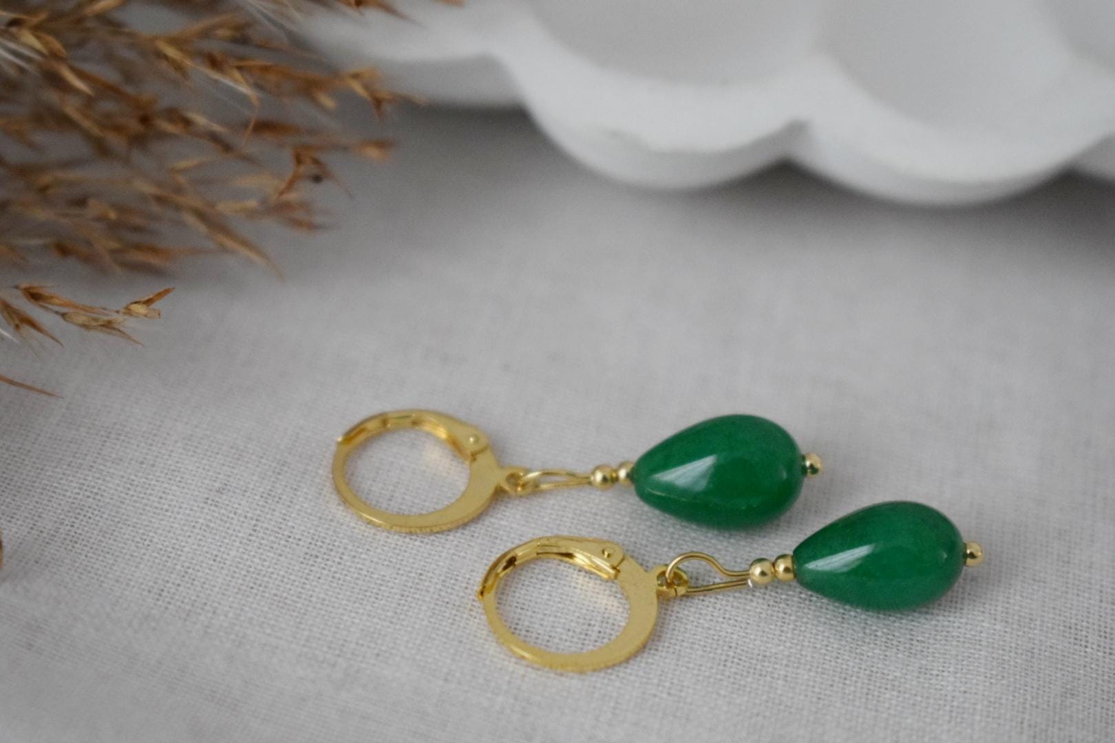 Green jade teardrop ears, Small huggies with drop gemstone, Gold hoops green stone, Pearl hanging ears, Leverback, Jade Gift for her