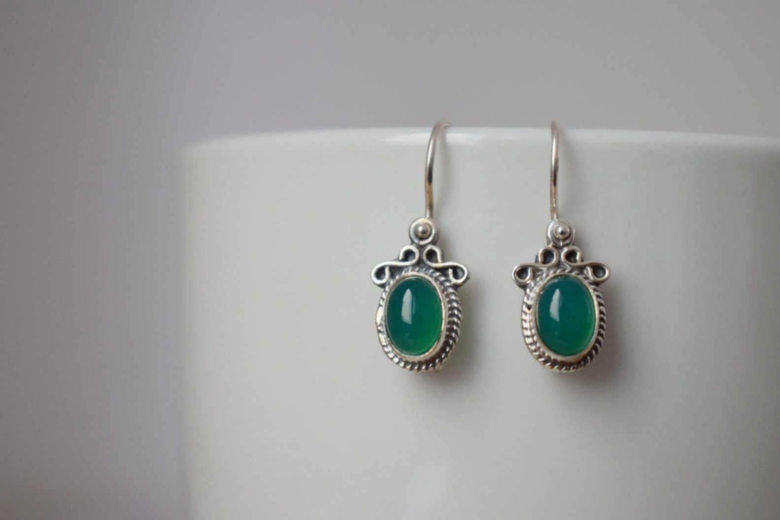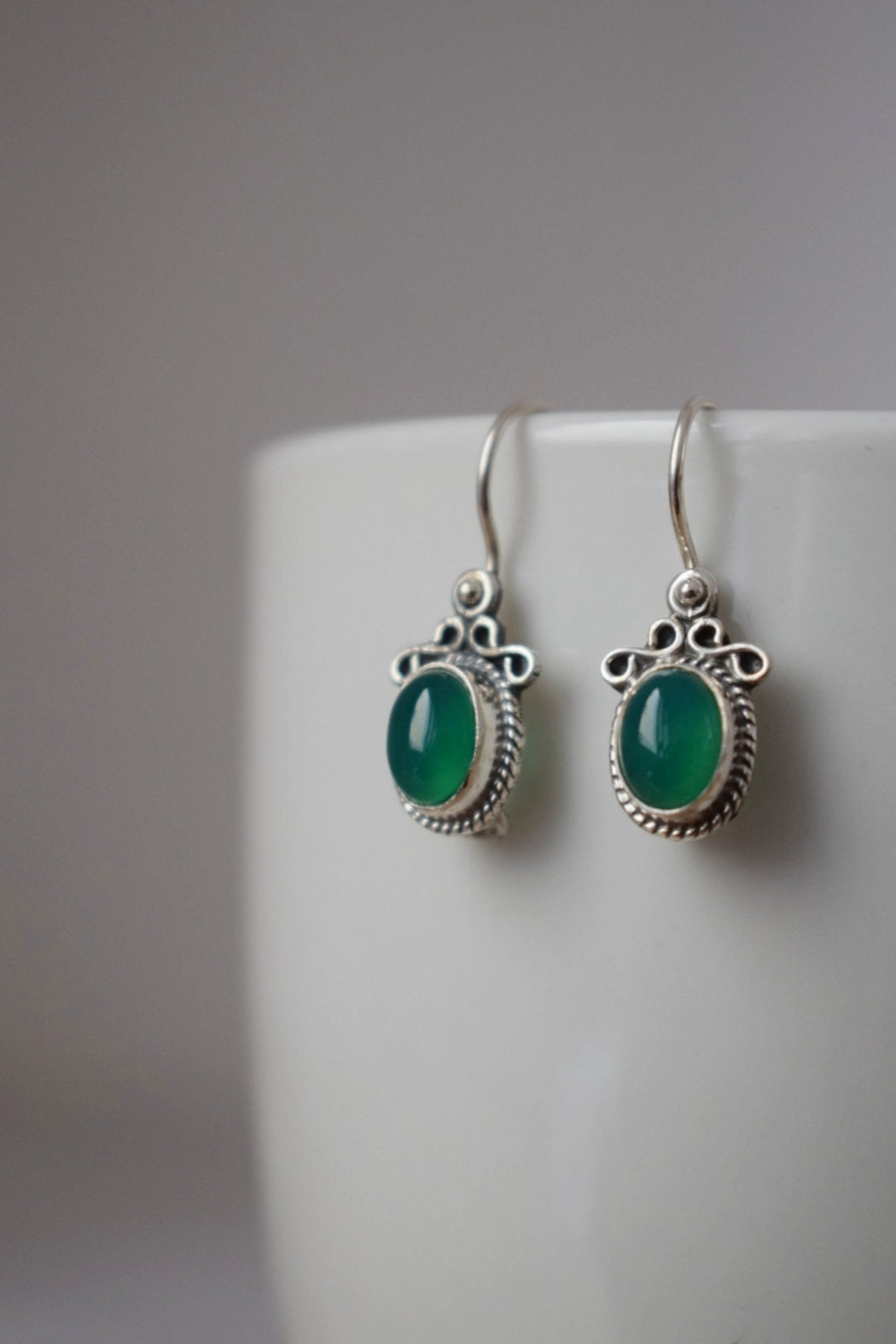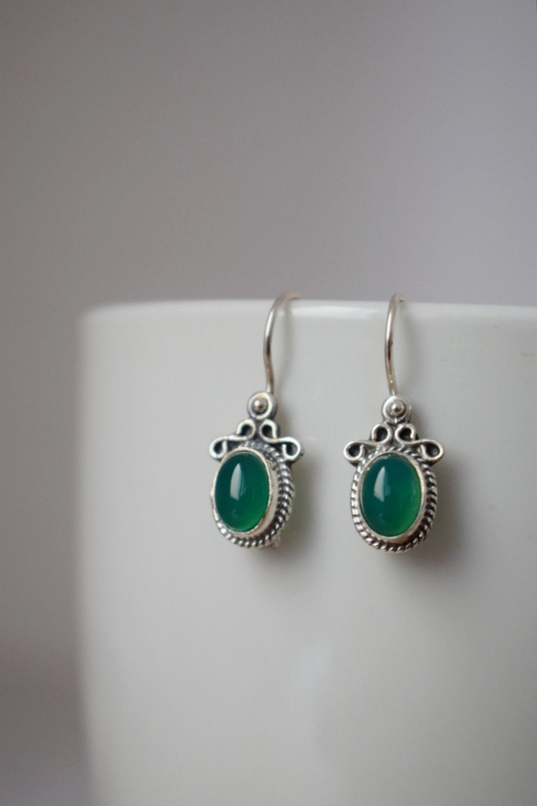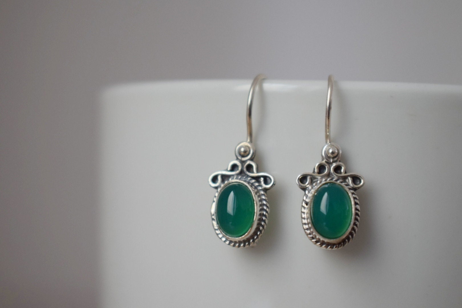Green onyx ears in 925 sterling silver, Oval gemstone ears, Ornament ears, Unique silver jewelry