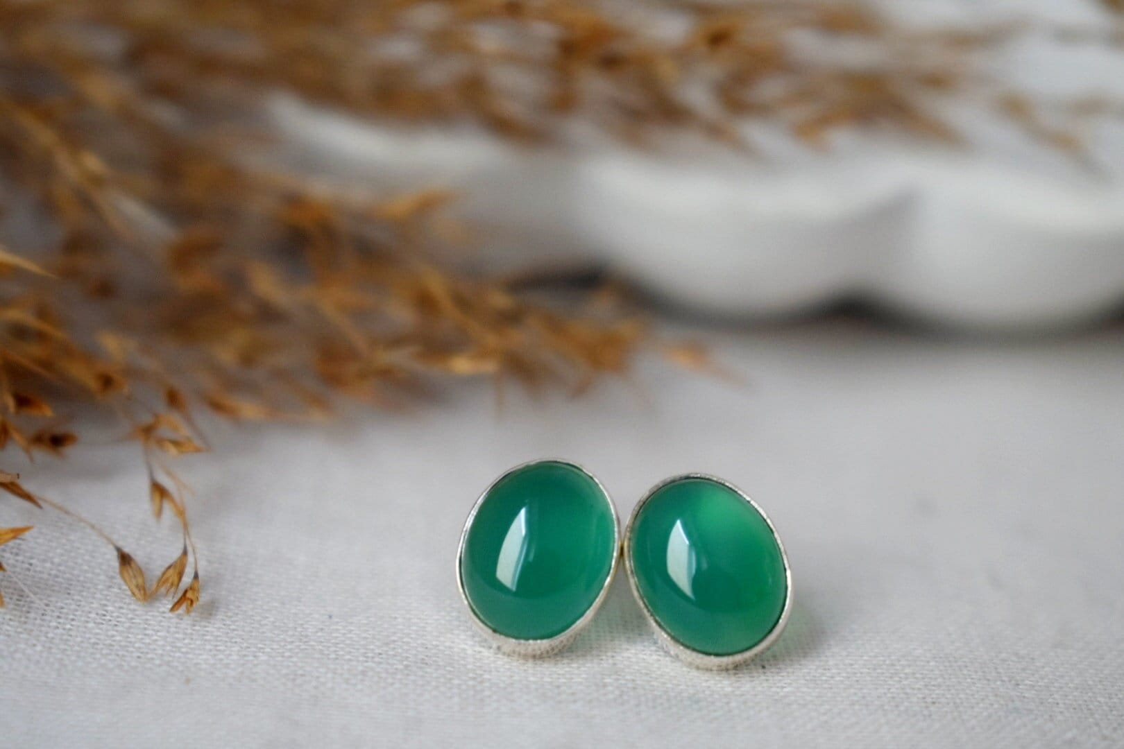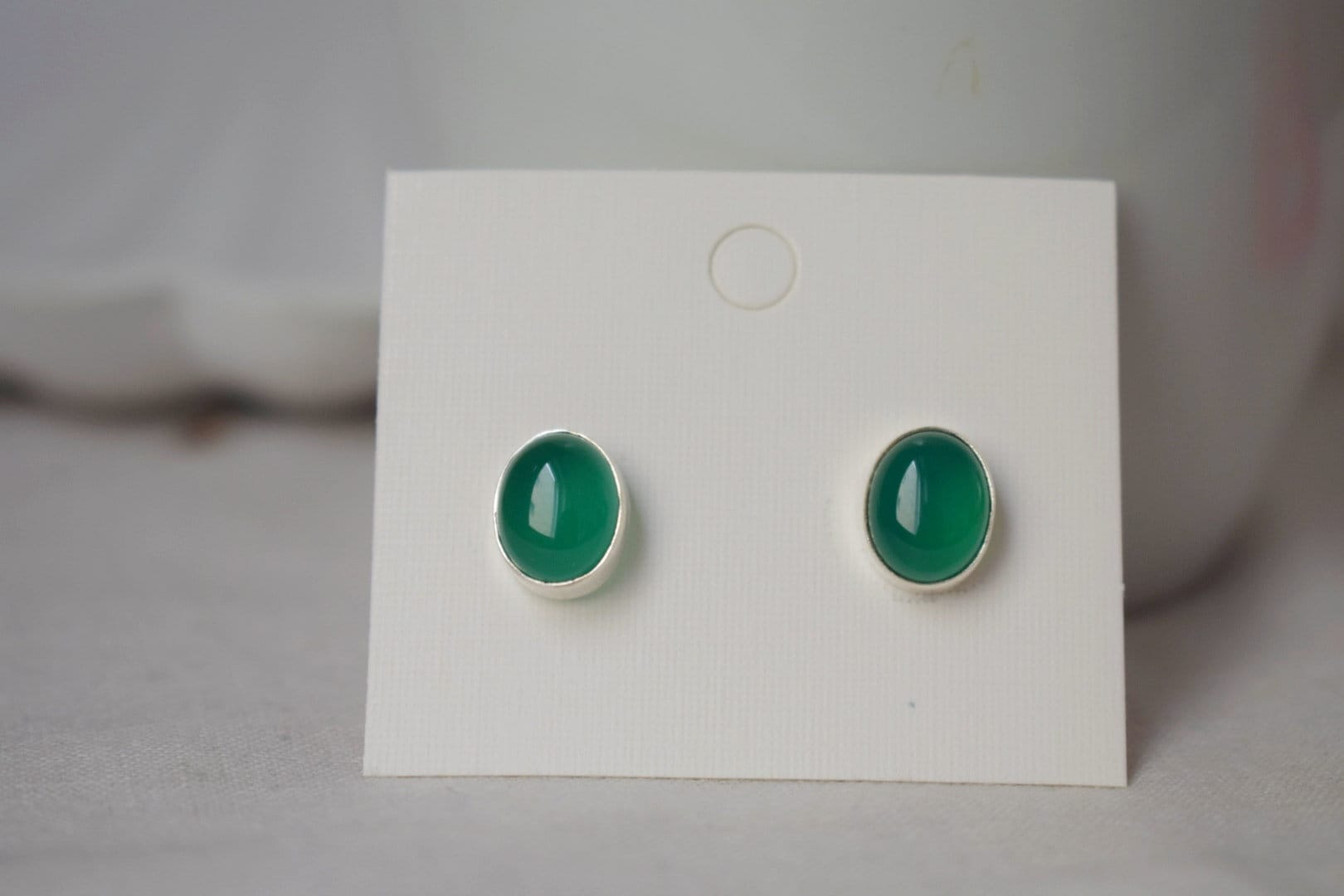 Green Onyx Stud Ears Sterling Silver, Small Oval Gemstone Push Back Ears, Birthstone 925 Silver Jewelry