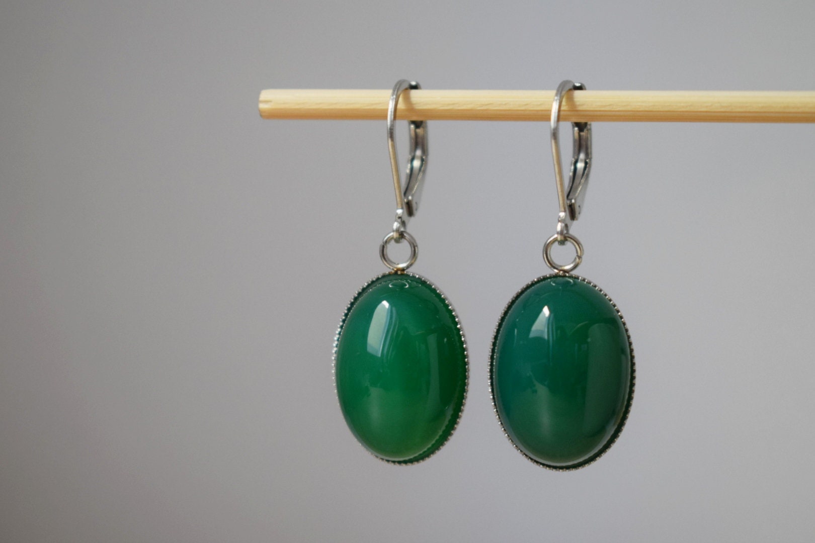 Huggie Hoop earrings with gemstone green agate, Oval stone dangle earrings, Stainless steel, Agate jewelry, Christmas gift for women