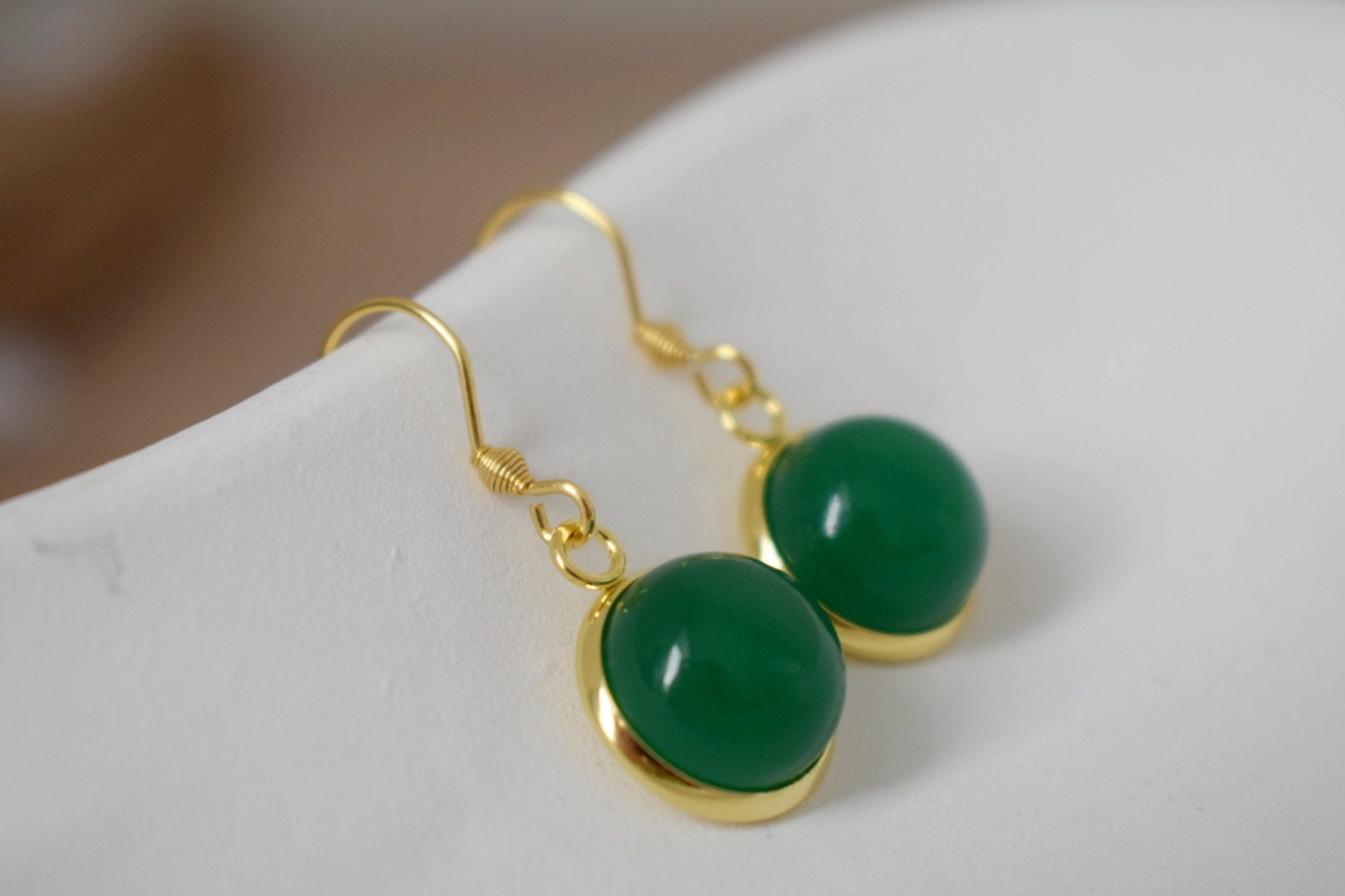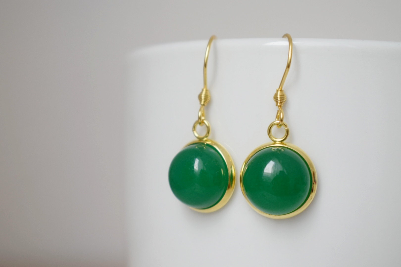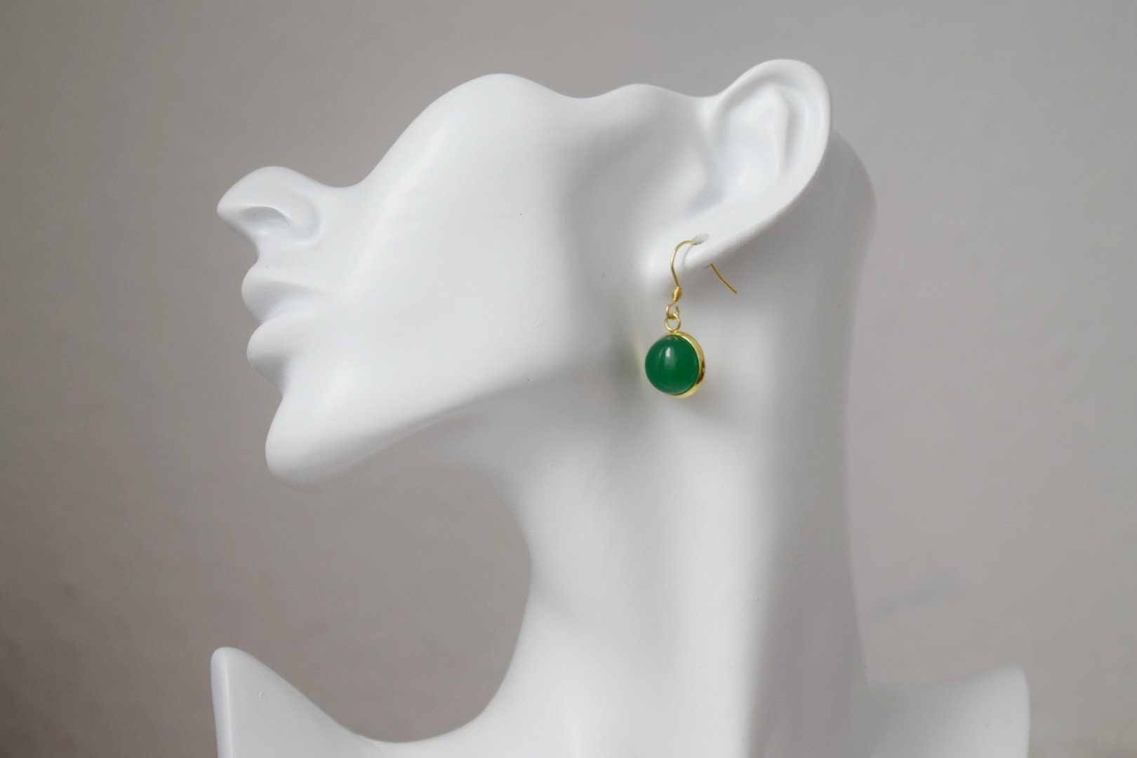 Jade Green Earrings, Gemstone round pendant earrings, 10mm stone dangle earrings, 18k Gold plated stainless steel jewelry, Best Gift for her
