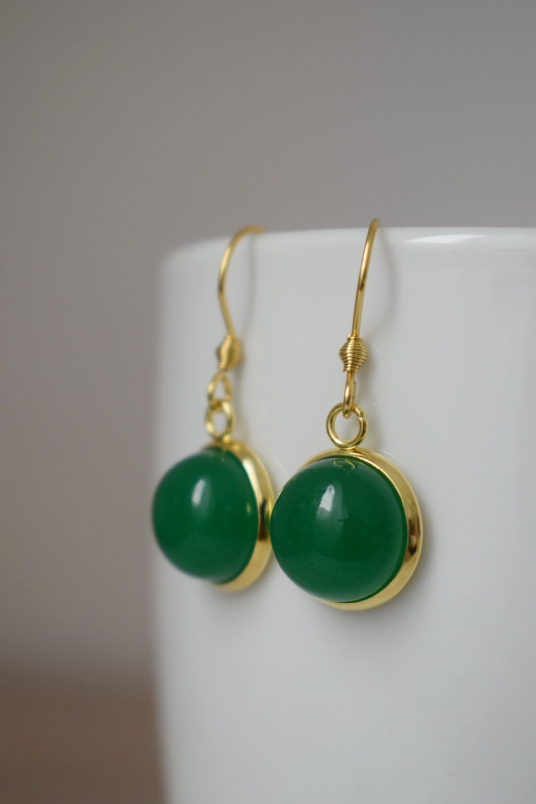 Jade Green Ears, Gemstone round pendant ears, 10mm stone dangle ears, Gold plated stainless steel jade jewelry, Gift for her