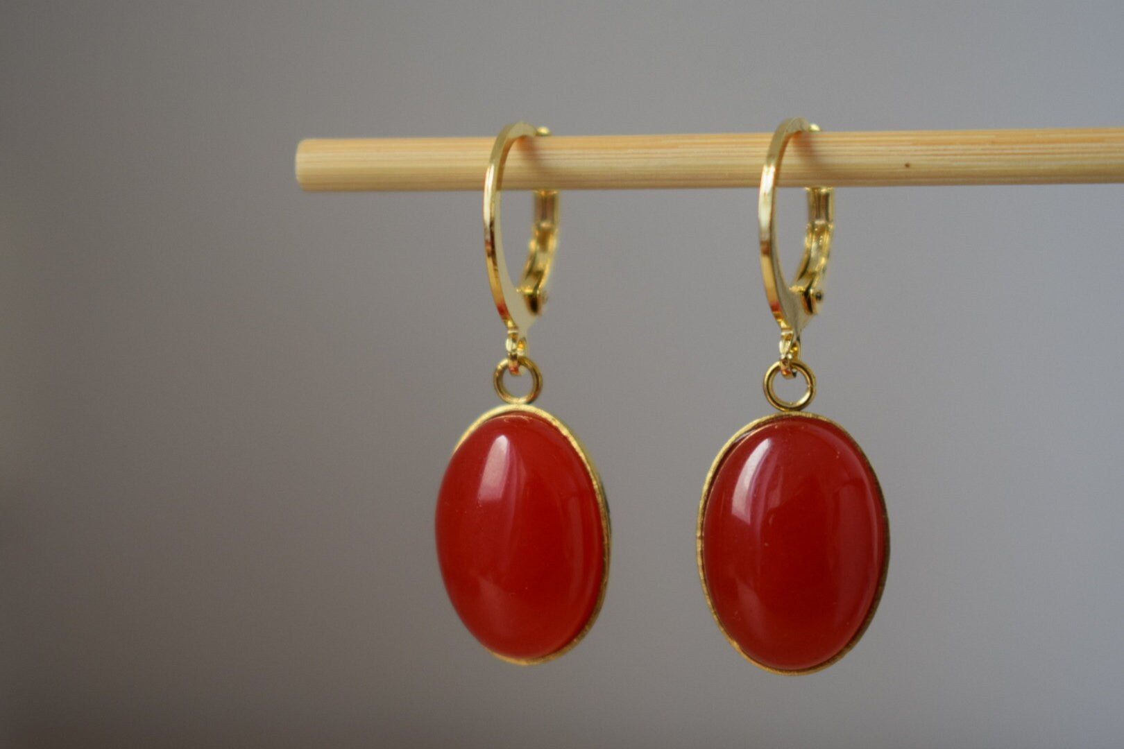 Jade red dangle earrings, Red gold gemstone huggie earrings, Hanging oval earrings, Red earrings for women, Jade jewelry, Gift for her