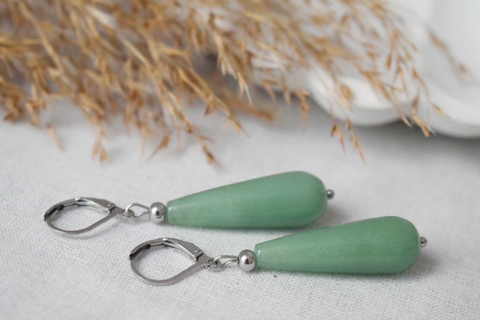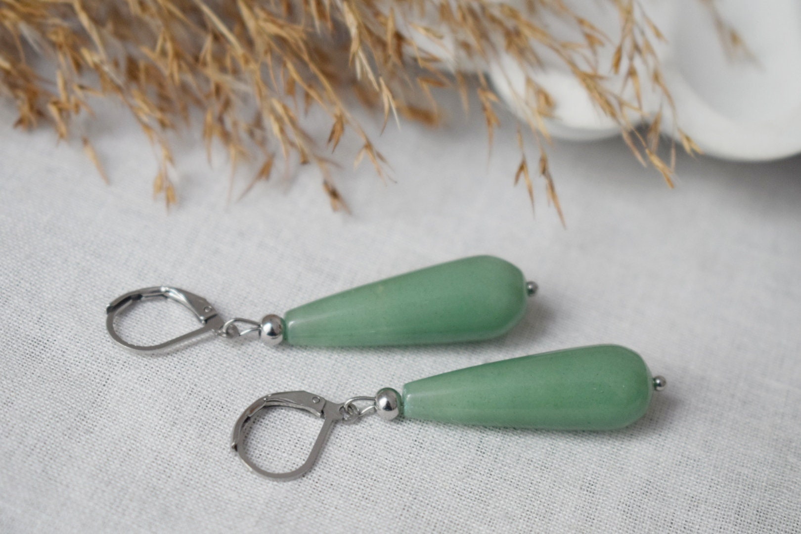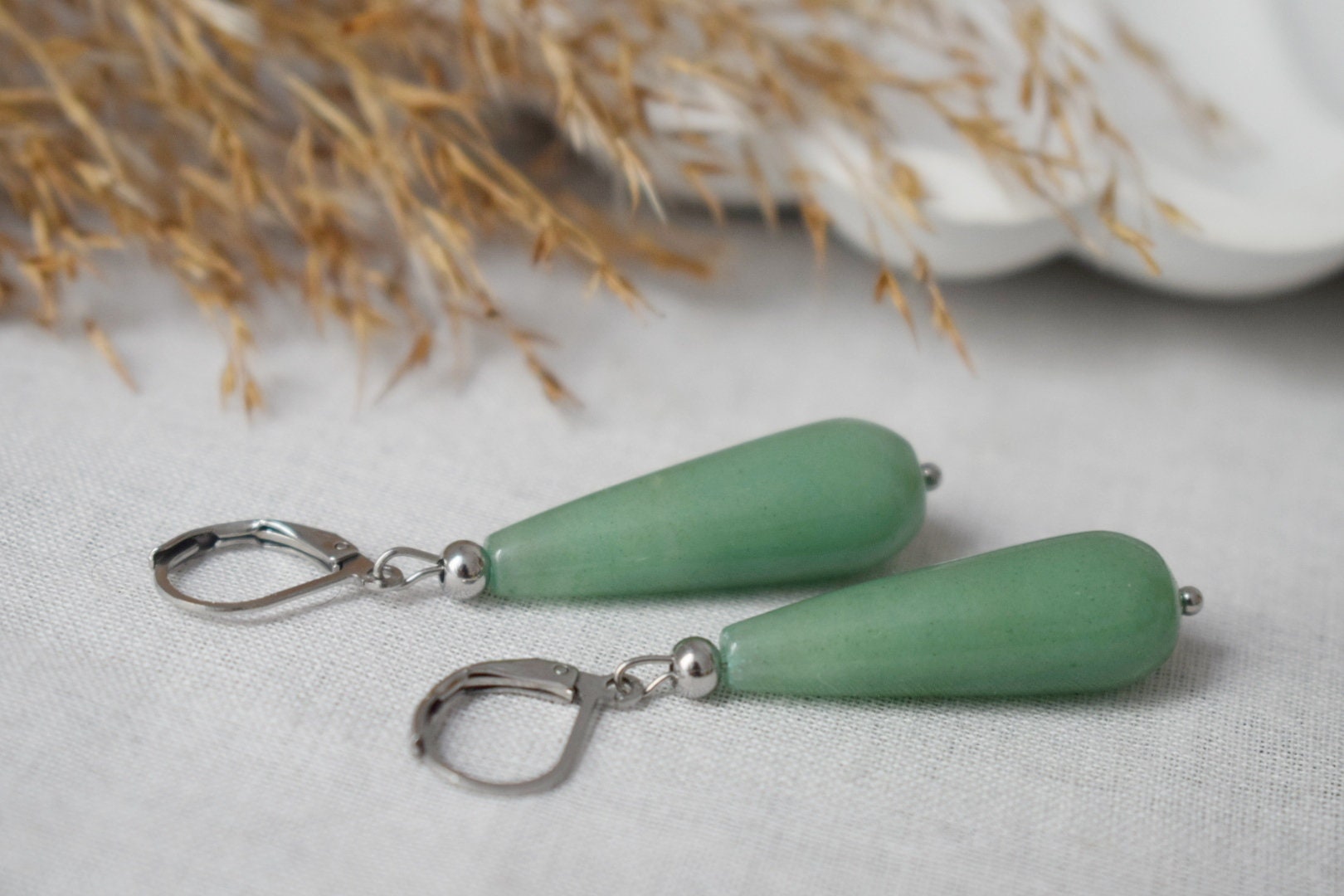 Long teardrop aventurine dangle earrings, Green silver gemstone drop hoops, Natural aventurine jewelry giftBest christmas gift
