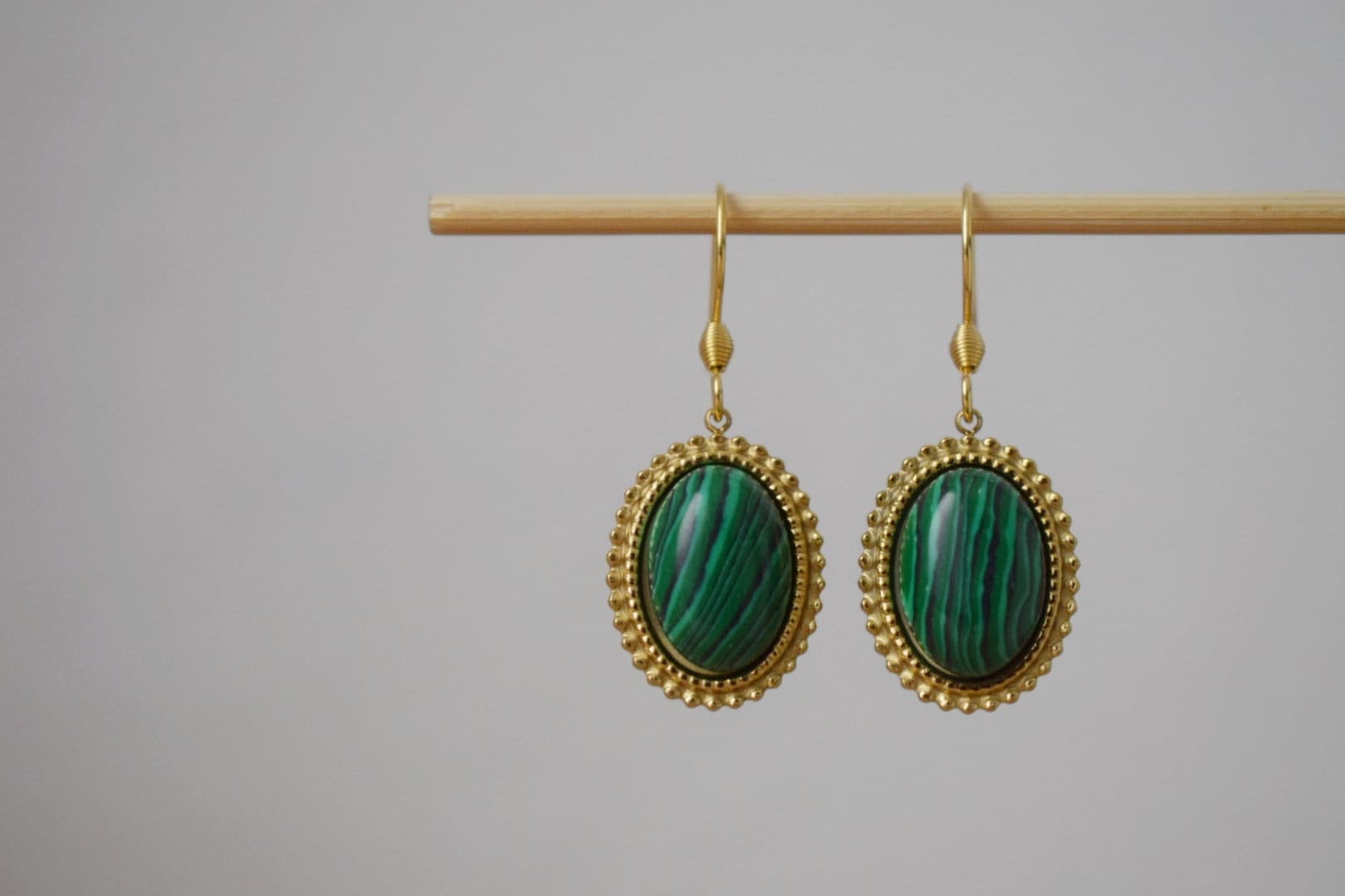 Malachite Ears, Oval Dangle Gemstone Ears, Green Malachite Jewelry, Birthstone Unique Ears