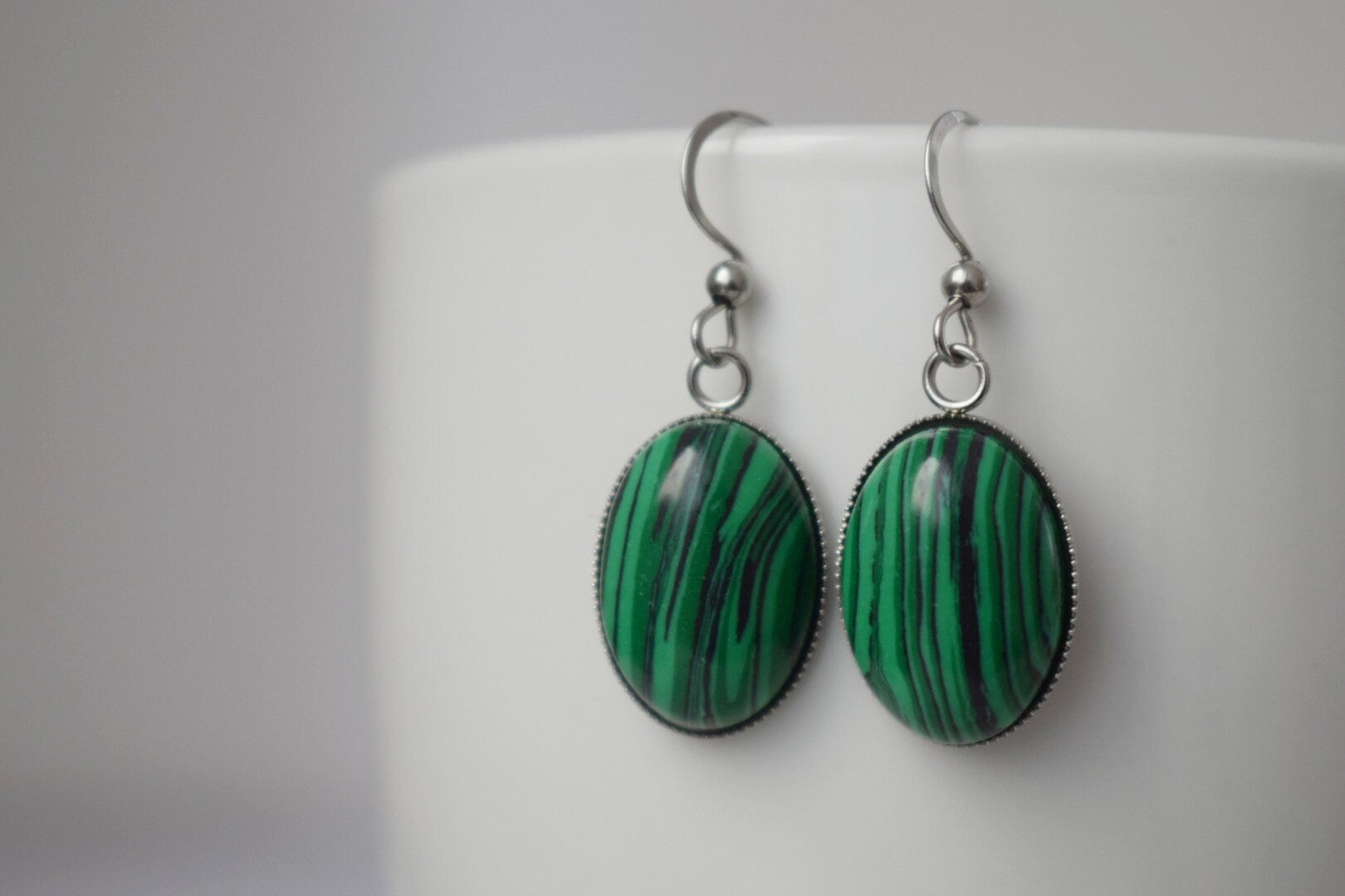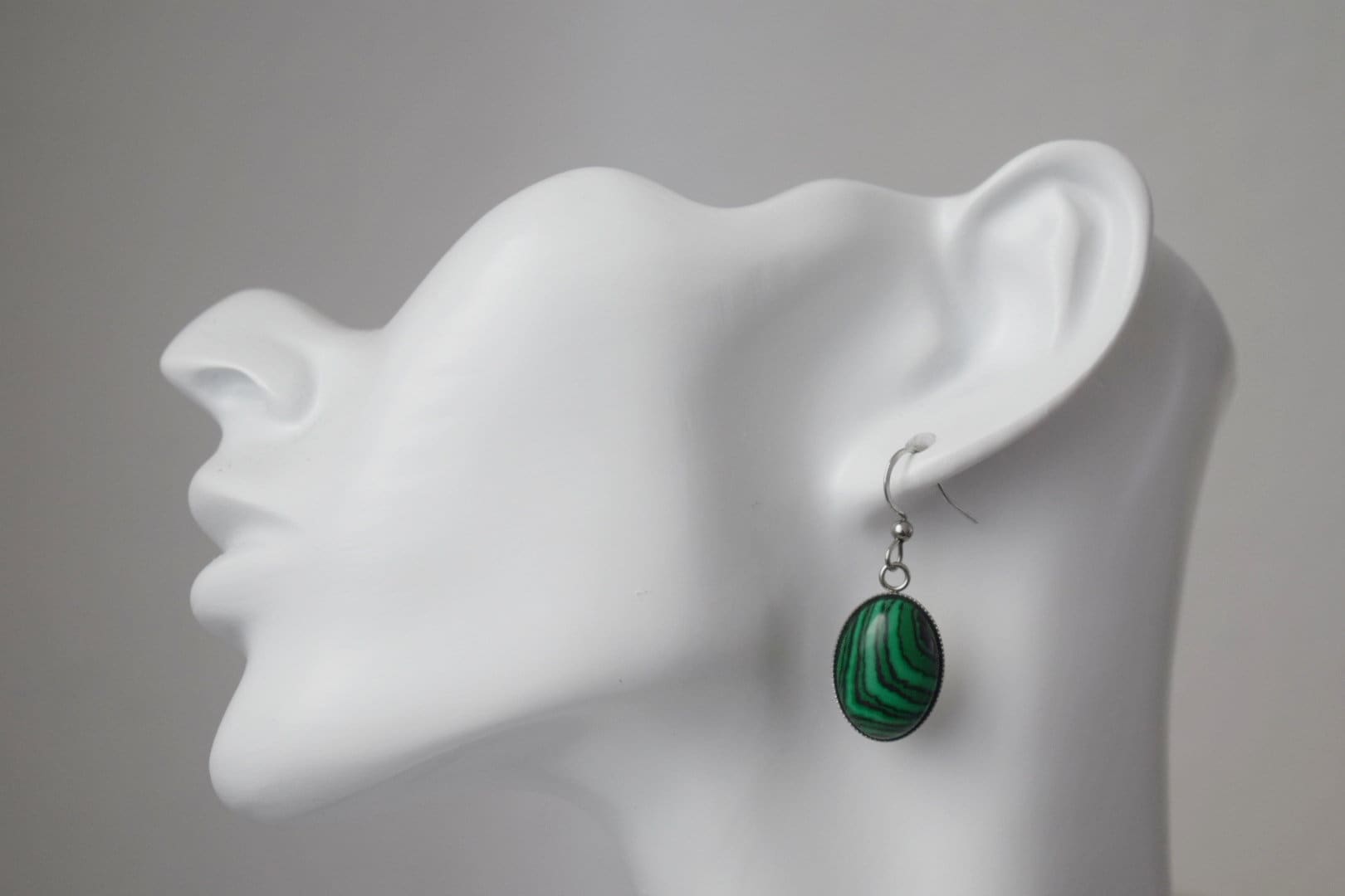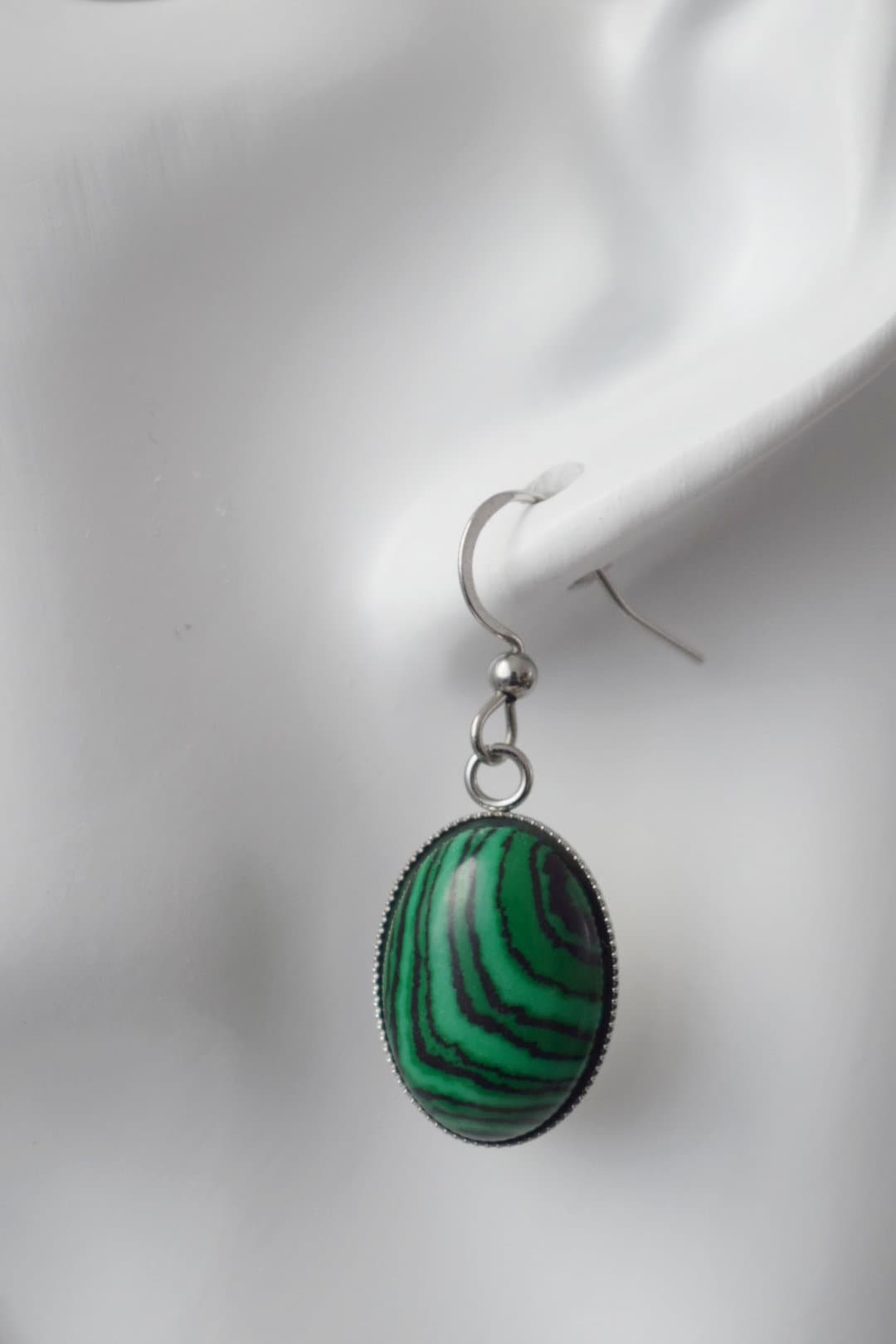 Malachite dangle ears, Oval green gemstone pendant with stainless steel ears hooks, Marbled jewelry gift