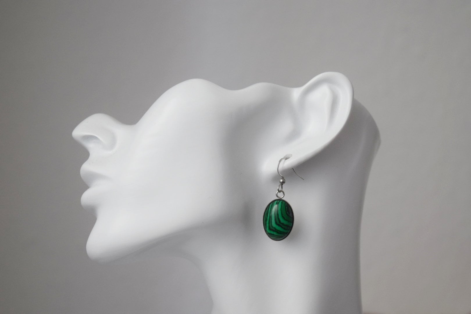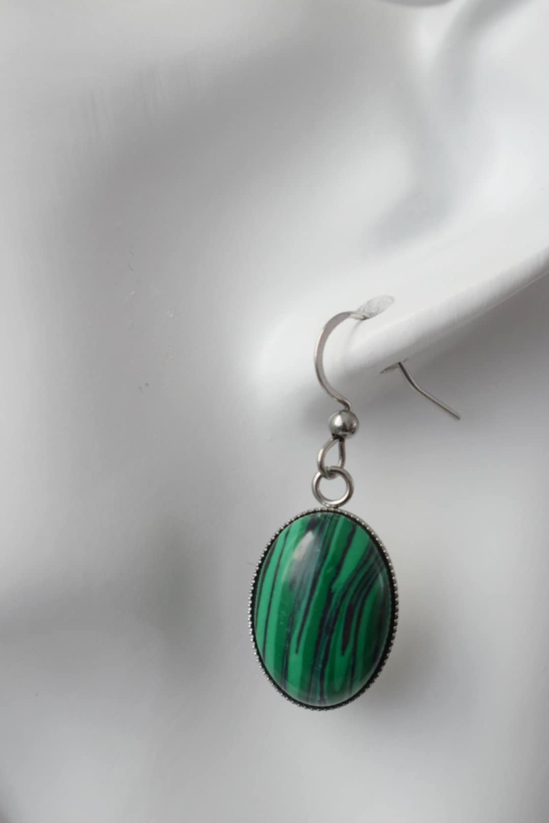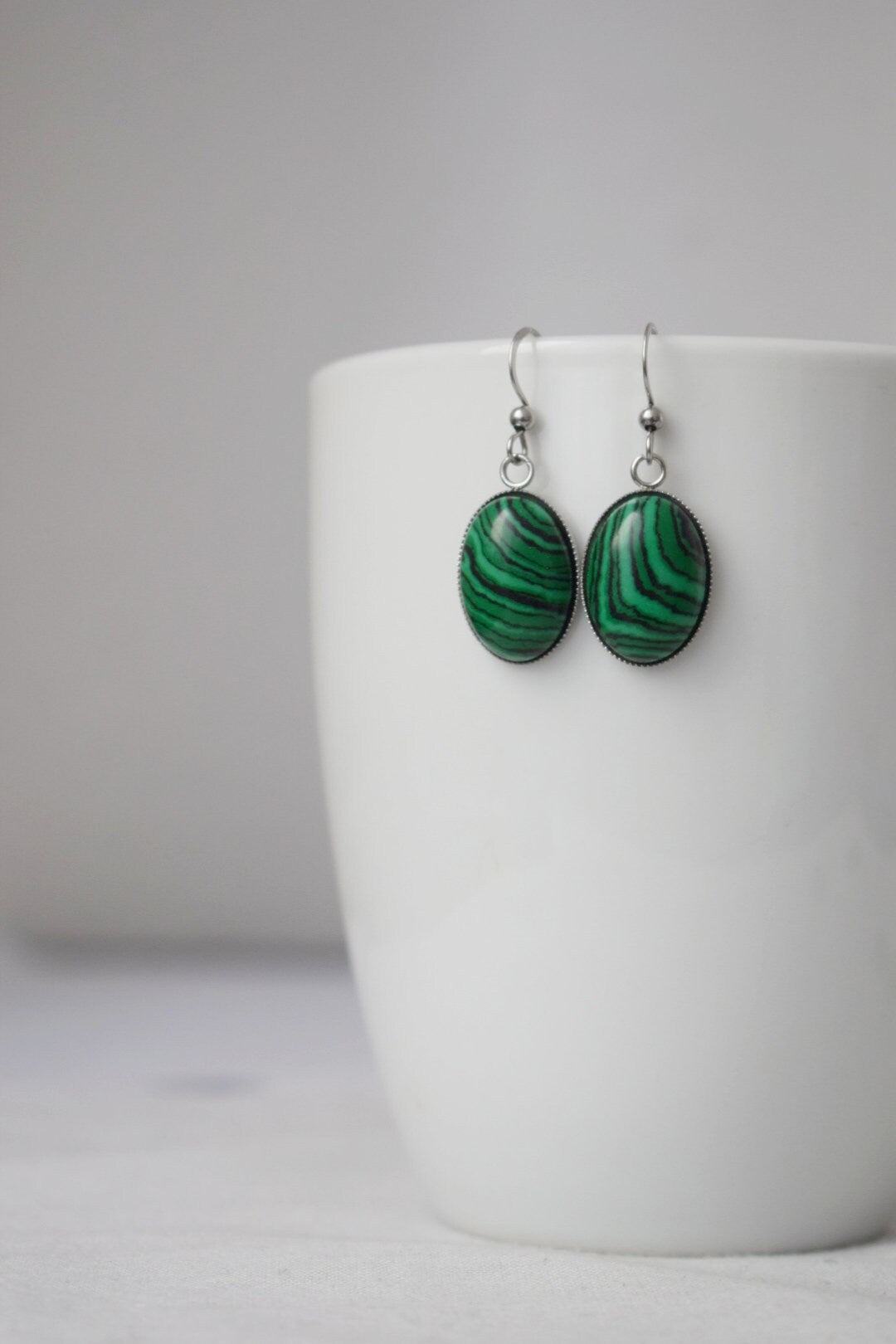 Malachite dangle ears, Oval green gemstone pendant with stainless steel ears hooks, Marbled jewelry gift