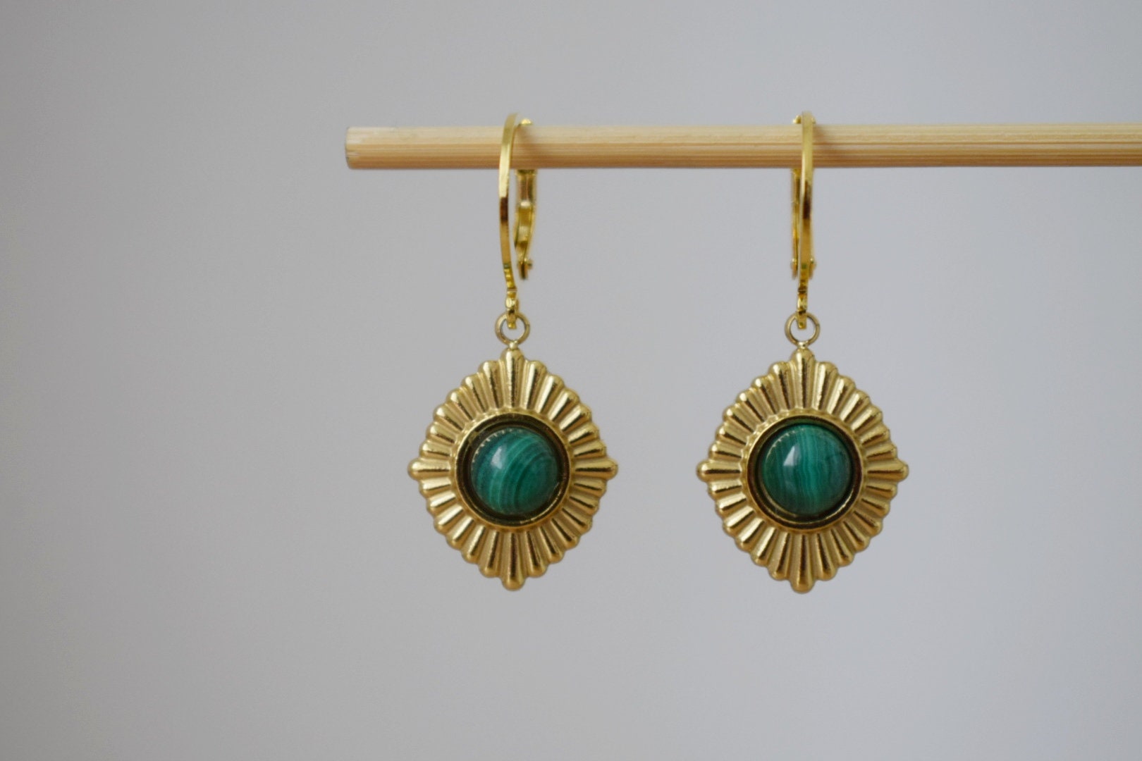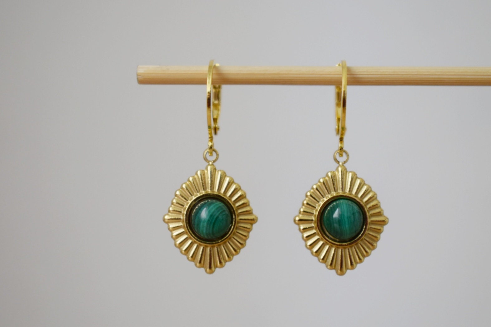 Malachite ears, Ornament dangling ears, Gemstone huggie hoops, Green gold color ears, Natural stone, Gold plated stainless steel jewelry, Gift for her