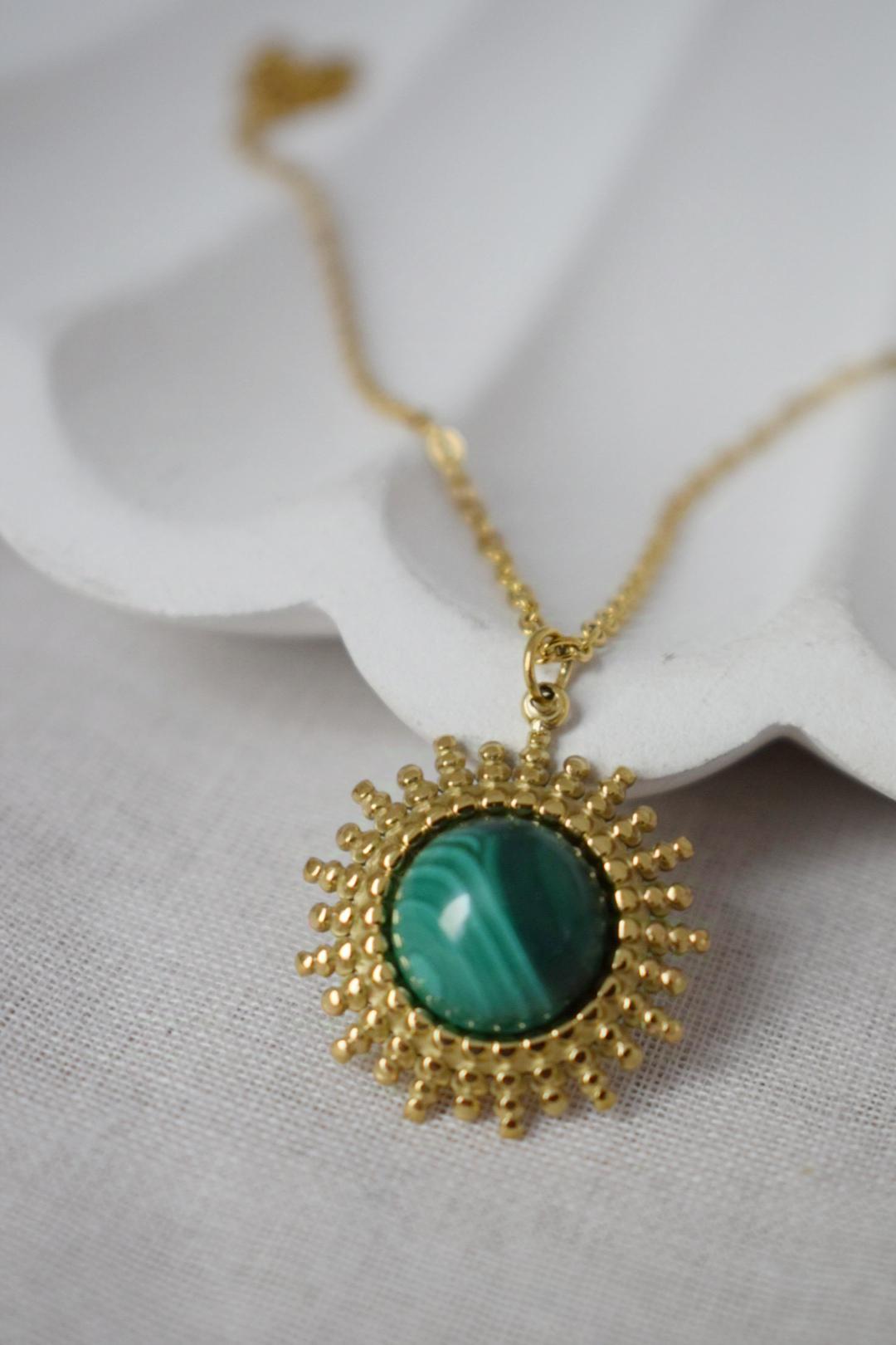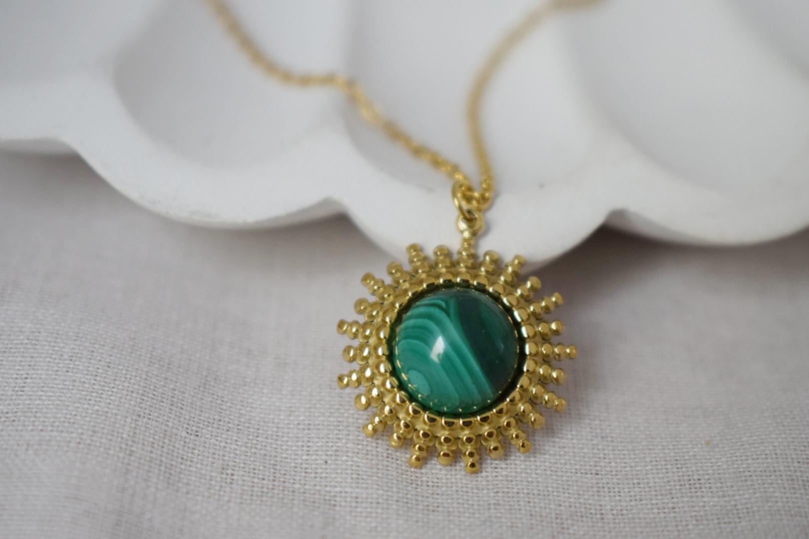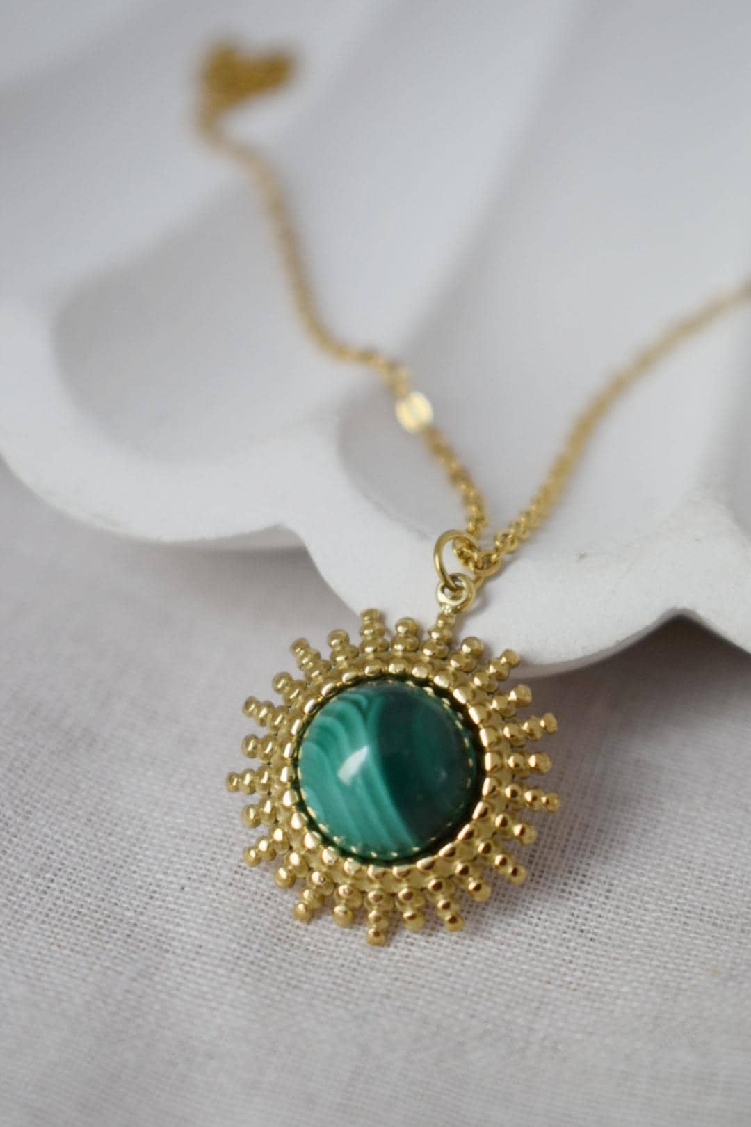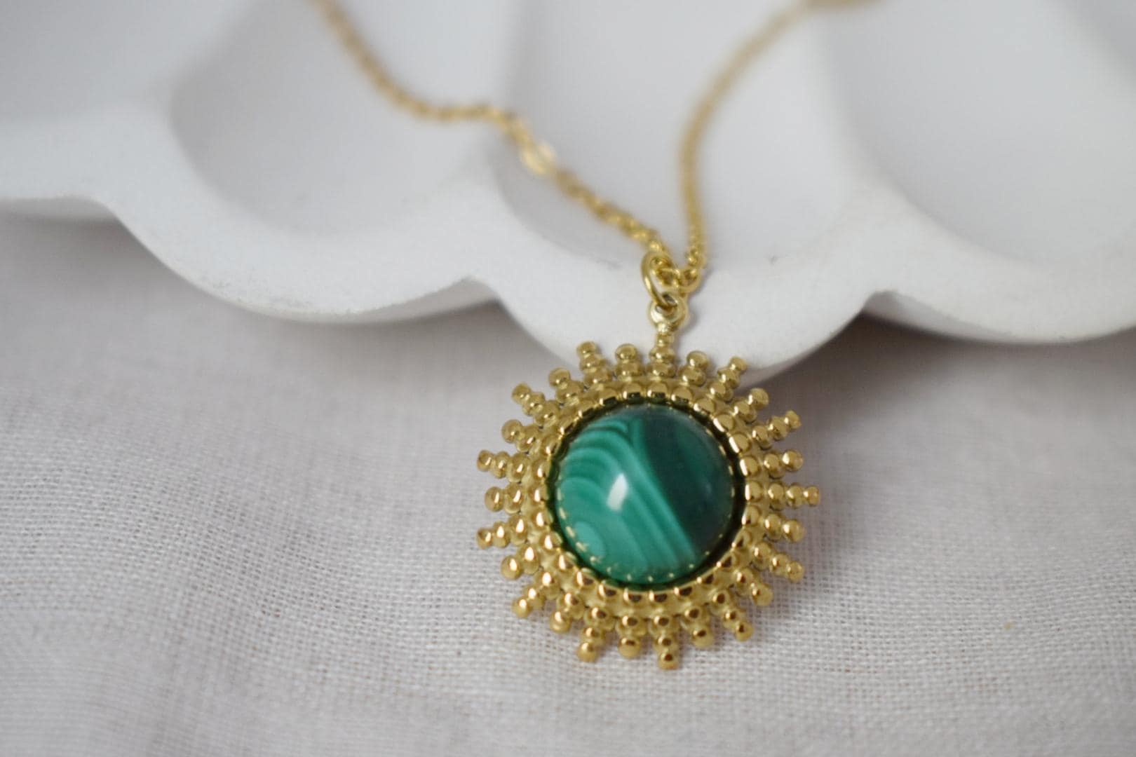 Malachite Necklace, Green Natural Stone, Mother's day gift, Sun Pendant, Adjustable Chain, Handmade Jewelry, Unique Gift for Her