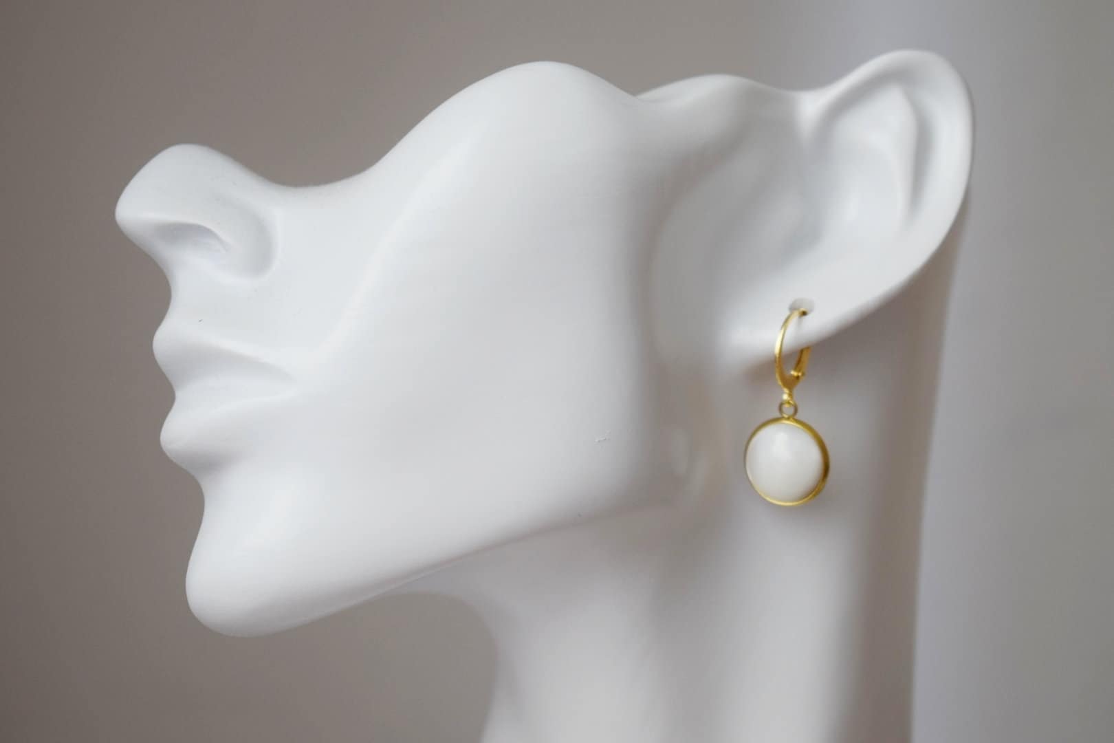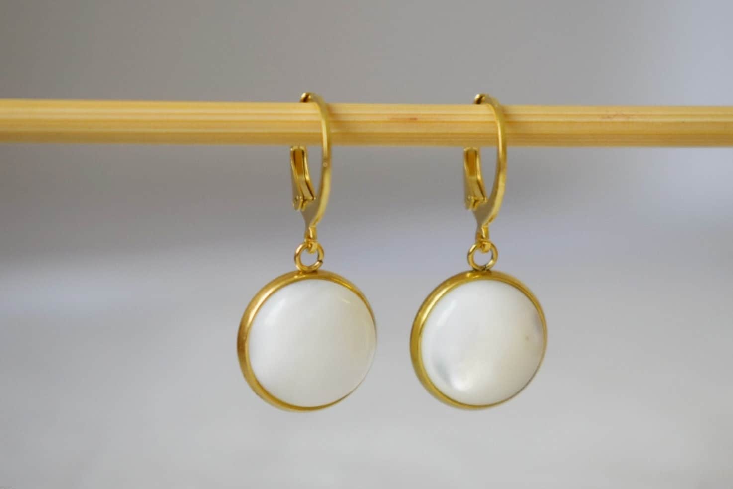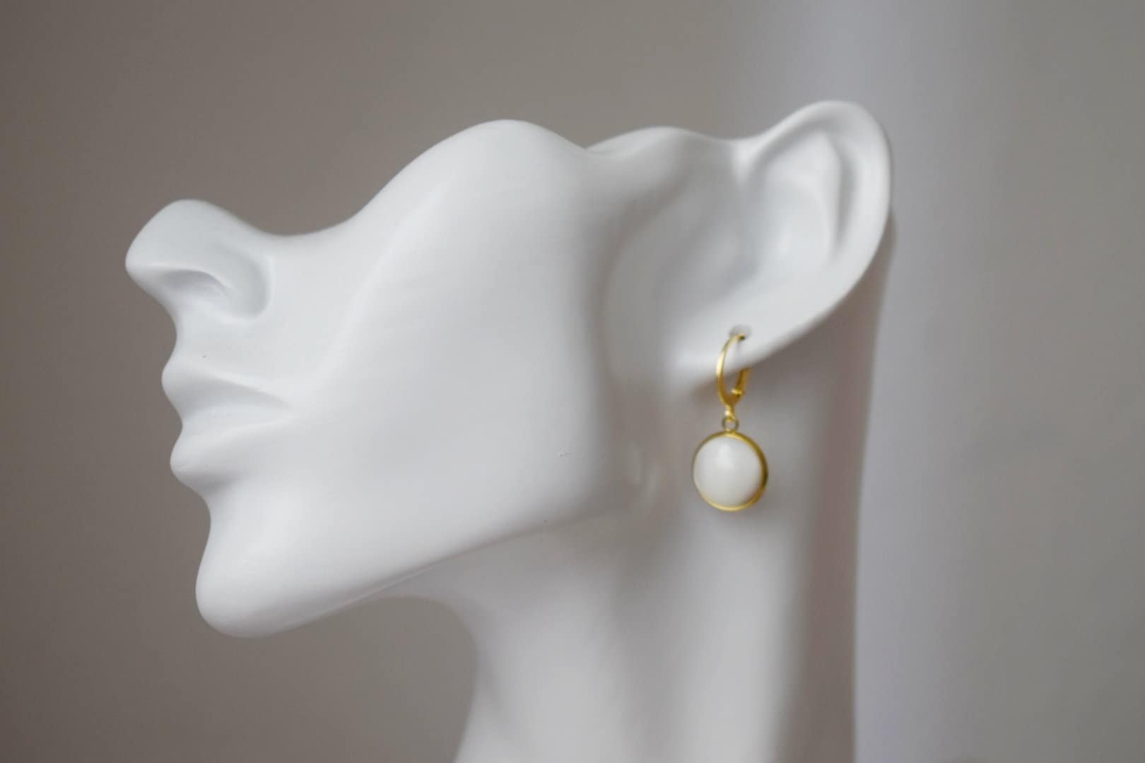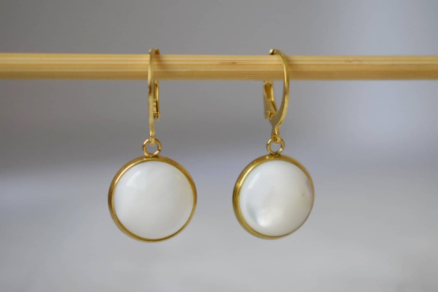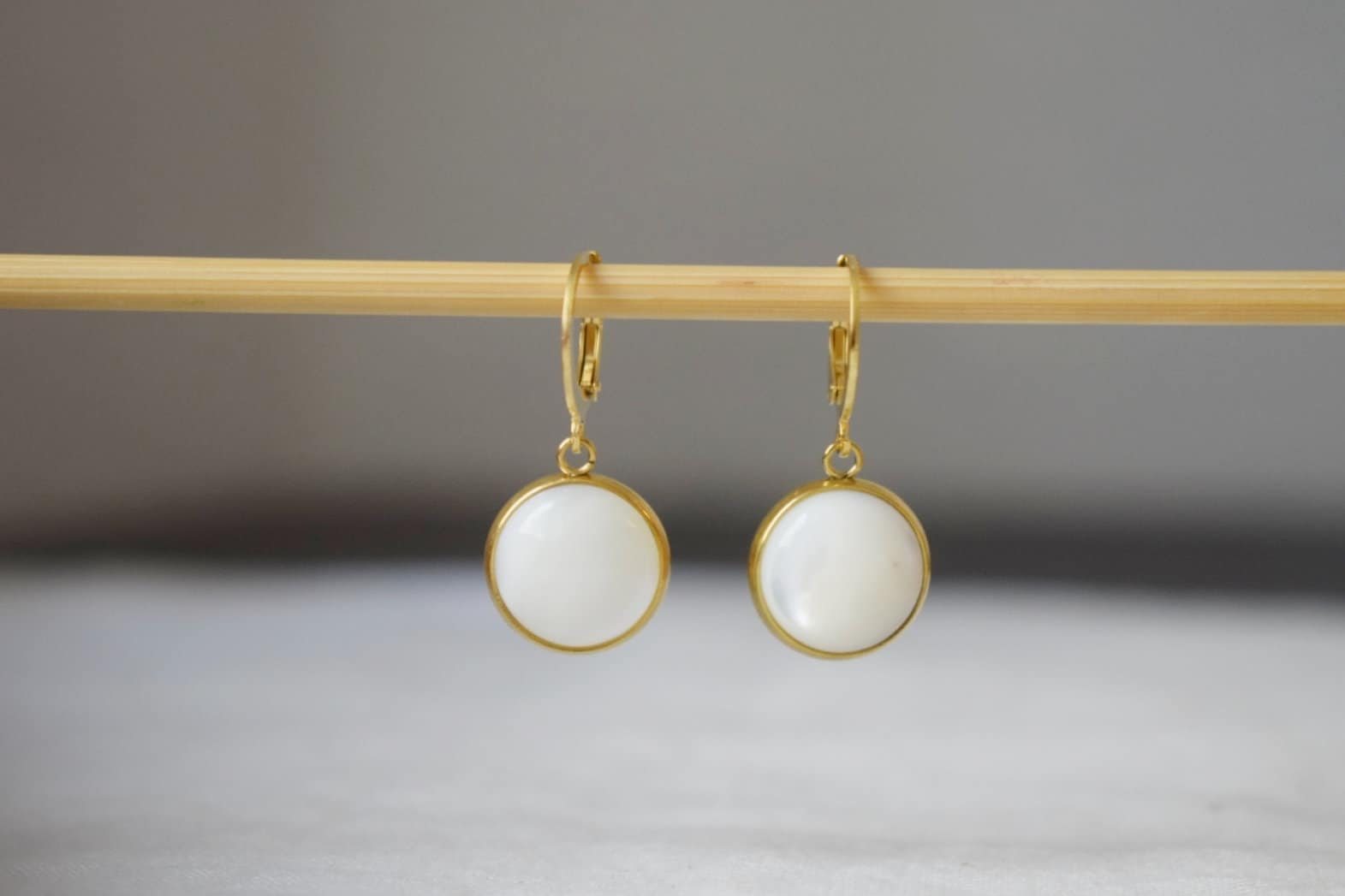 Mother of pearl earrings with gold plated stainless steel huggie hoops 12mm round pendant jewelry gift for herBest christmas gift