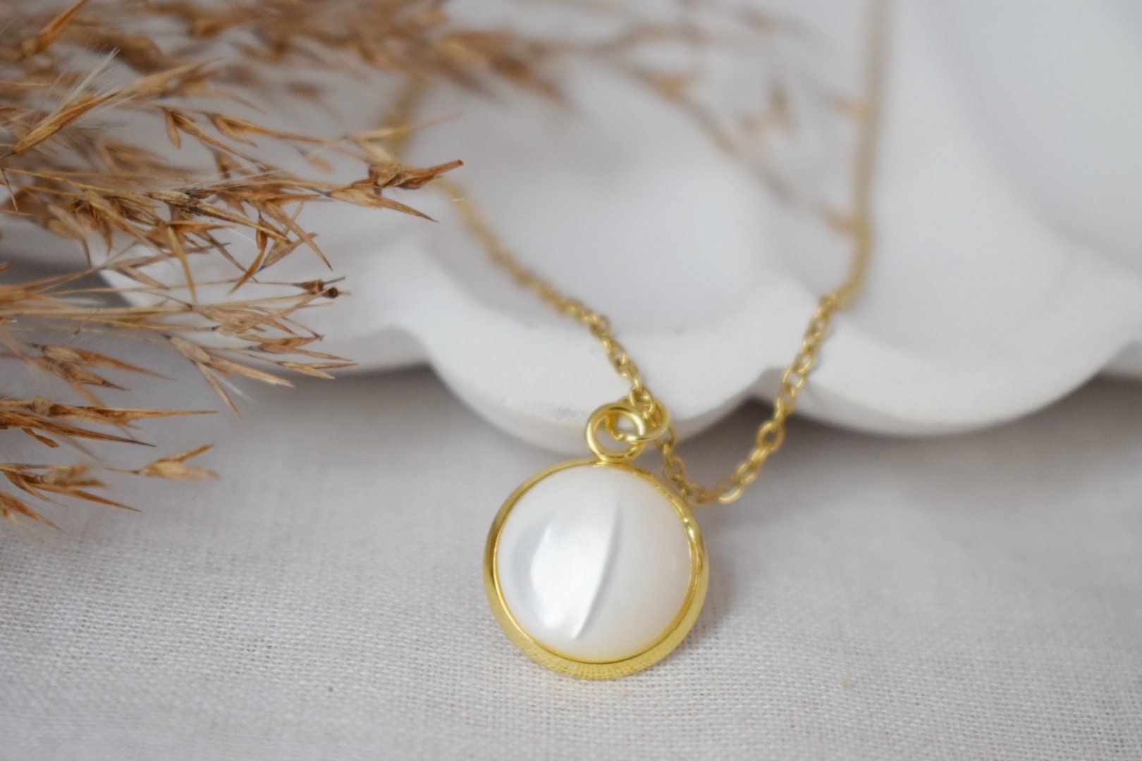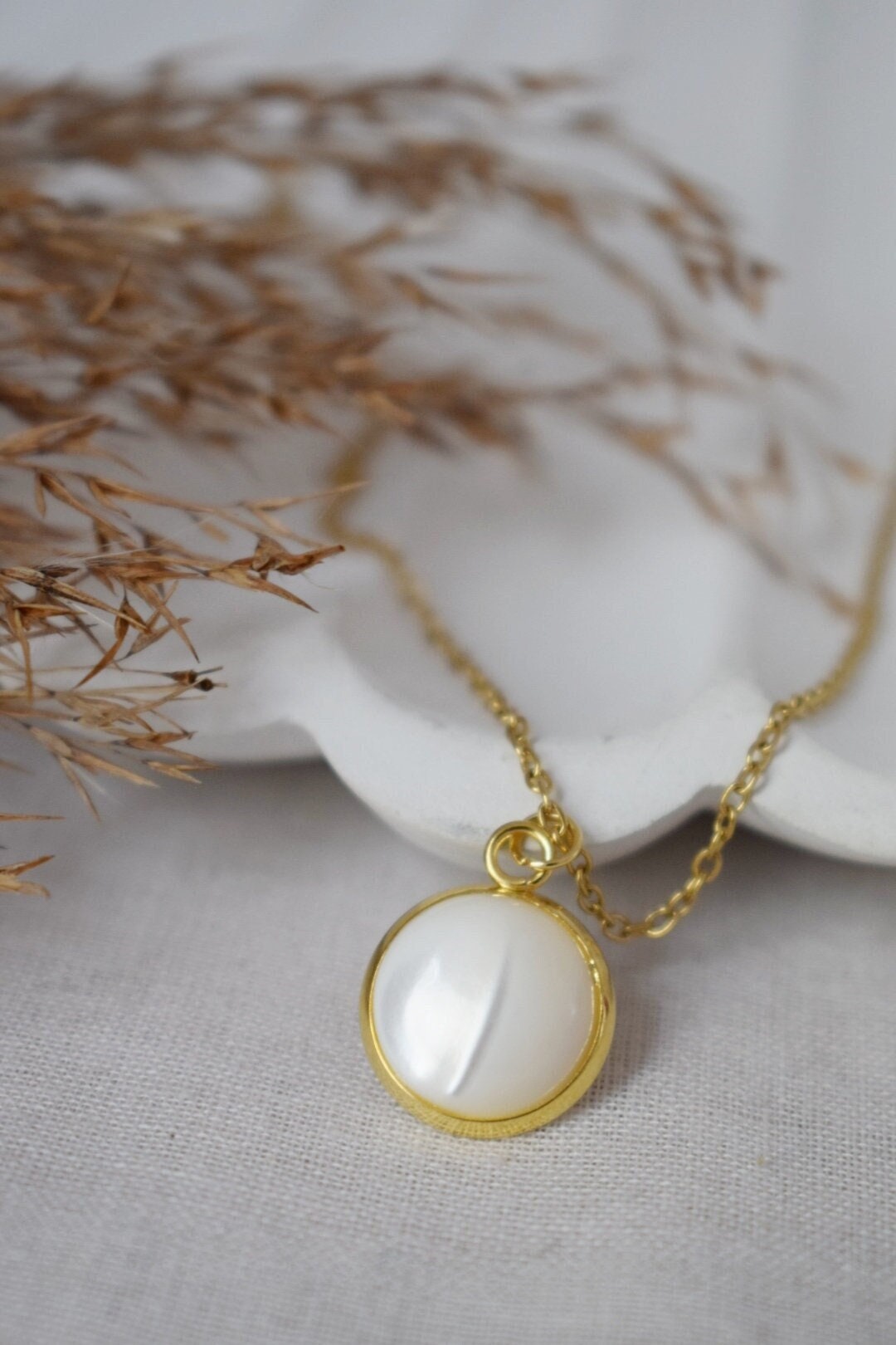 Mother of pearl shell necklace, Gold plated stainless steel round pendant, Minimalist jewelry