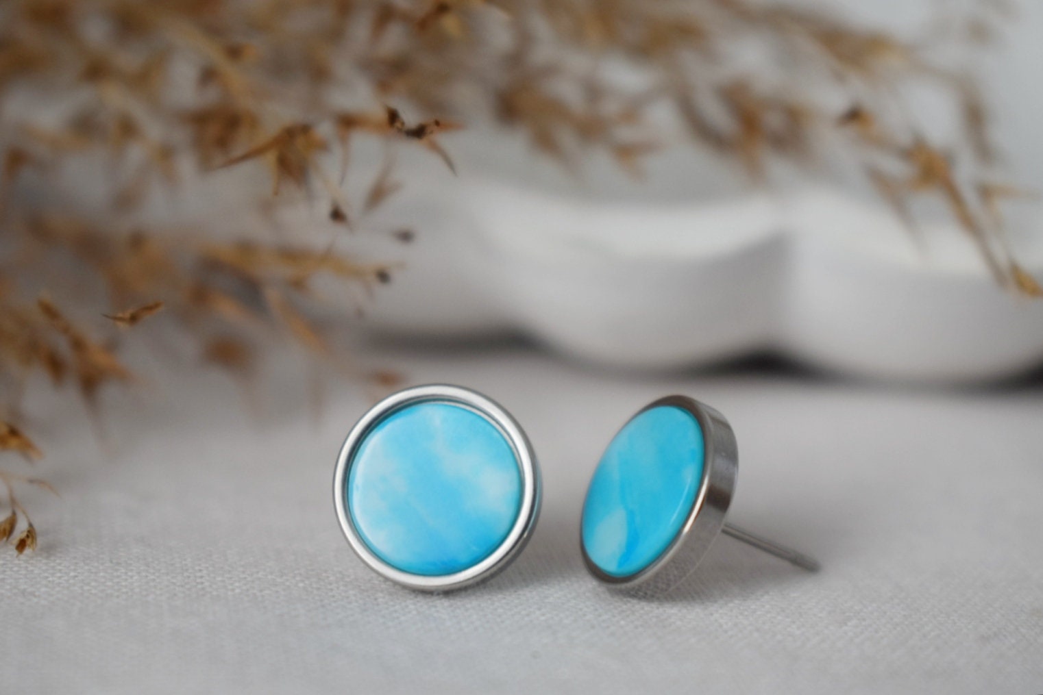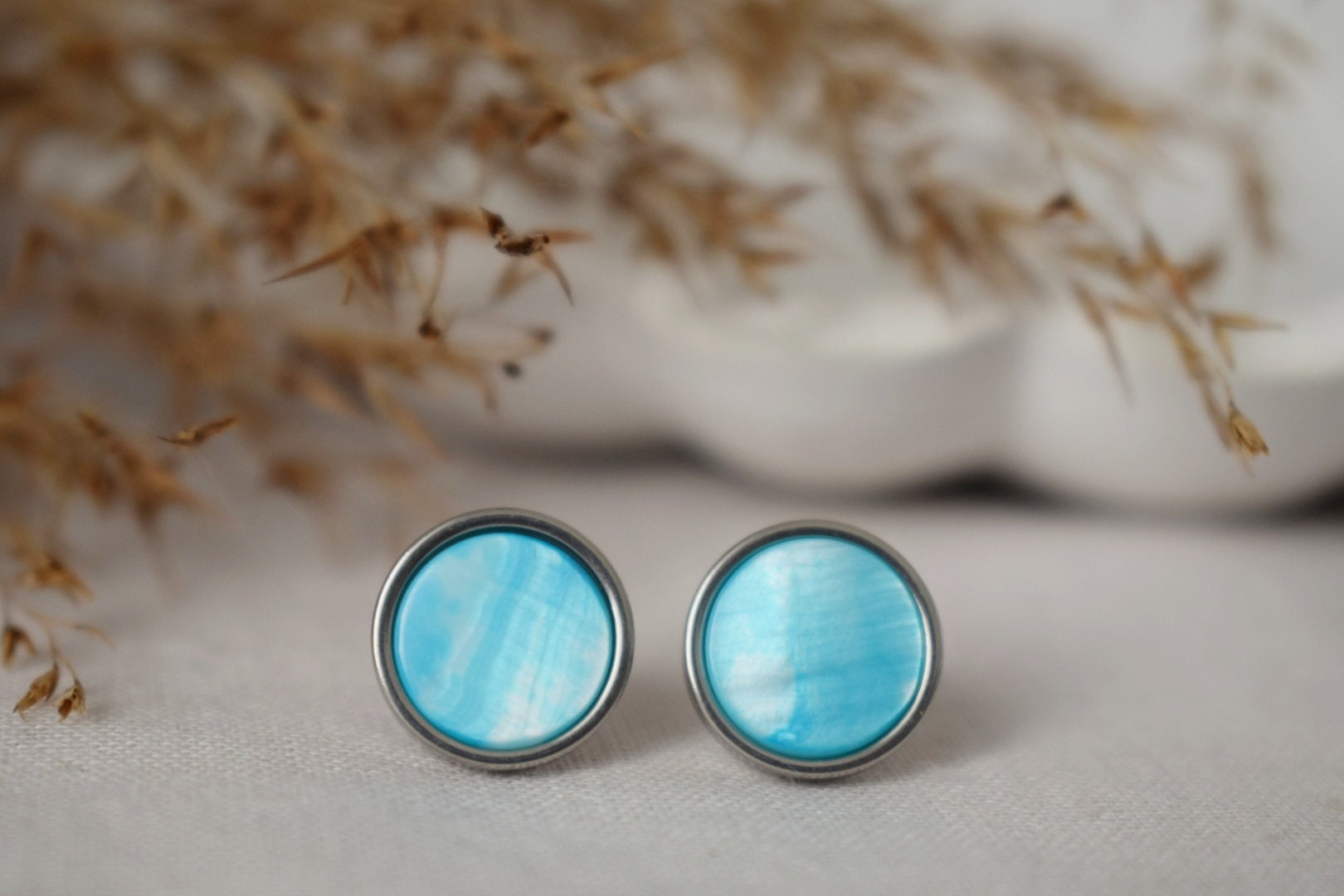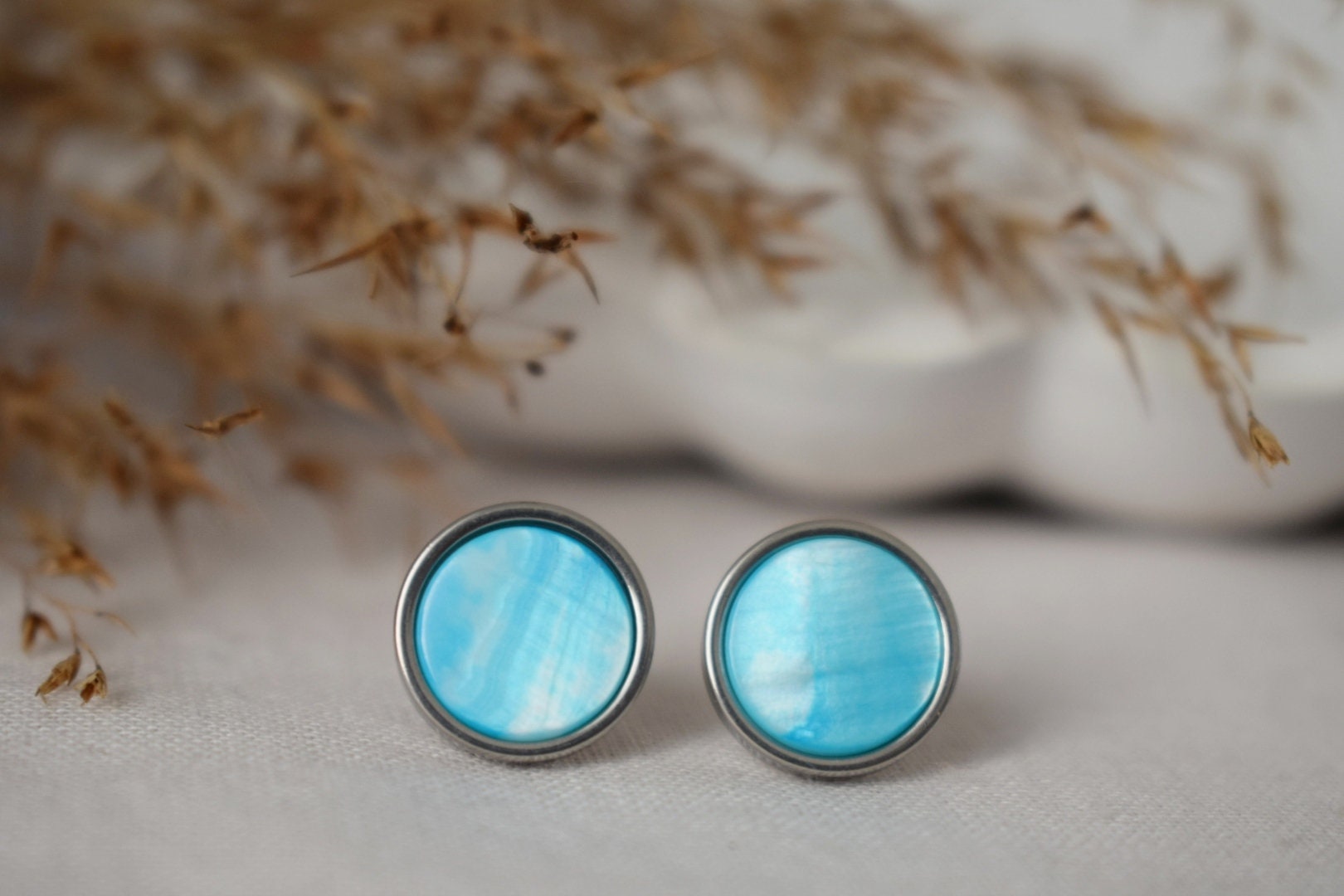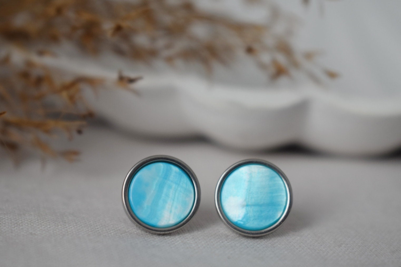 10mm massive stud ears frame and push back are made of with high quality stainless steel material, 2 Extra silikon push backs 10mm massive stud ears frame and push back are made of with high quality stainless steel material, 2 Extra silikon push backs. White shell & blue(cyan) shell (dyed) cabochons, jewelry glue. MatchingHighlights