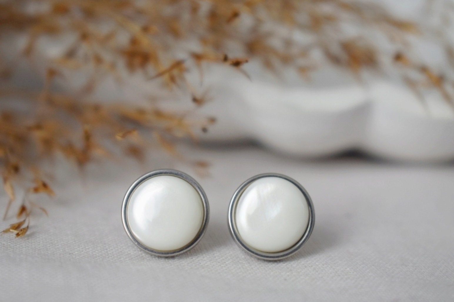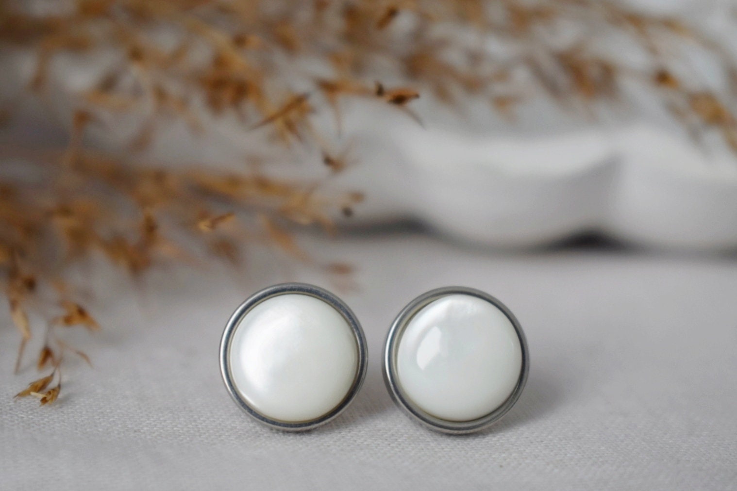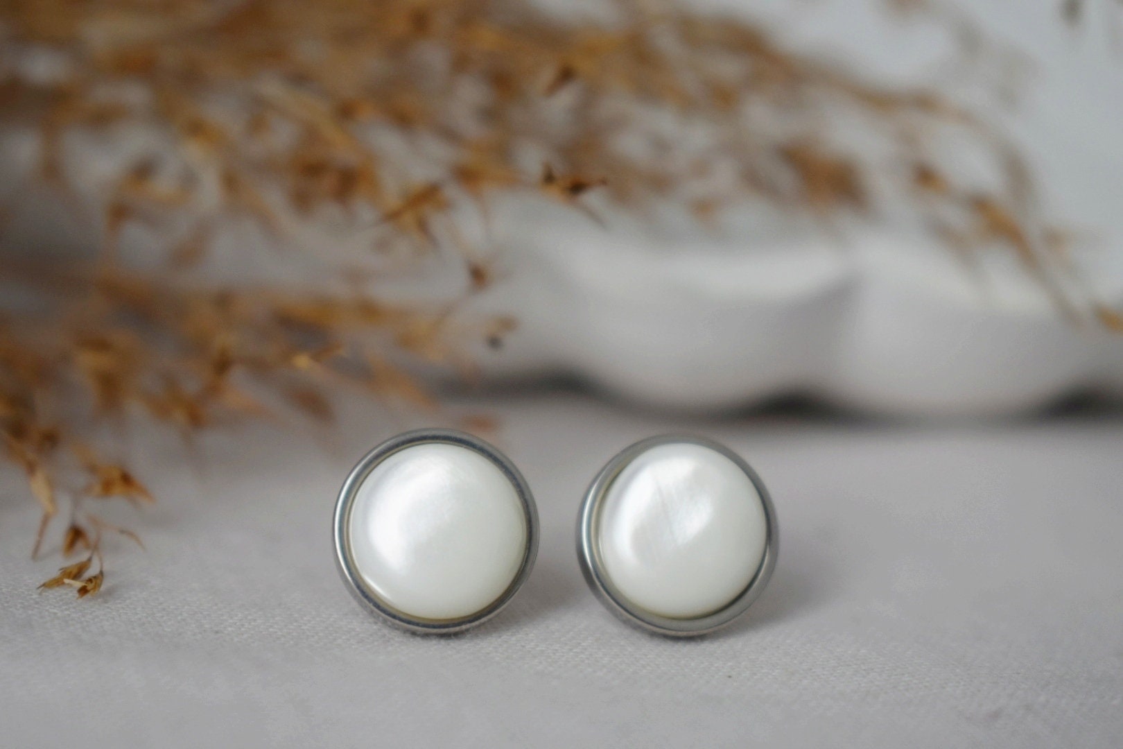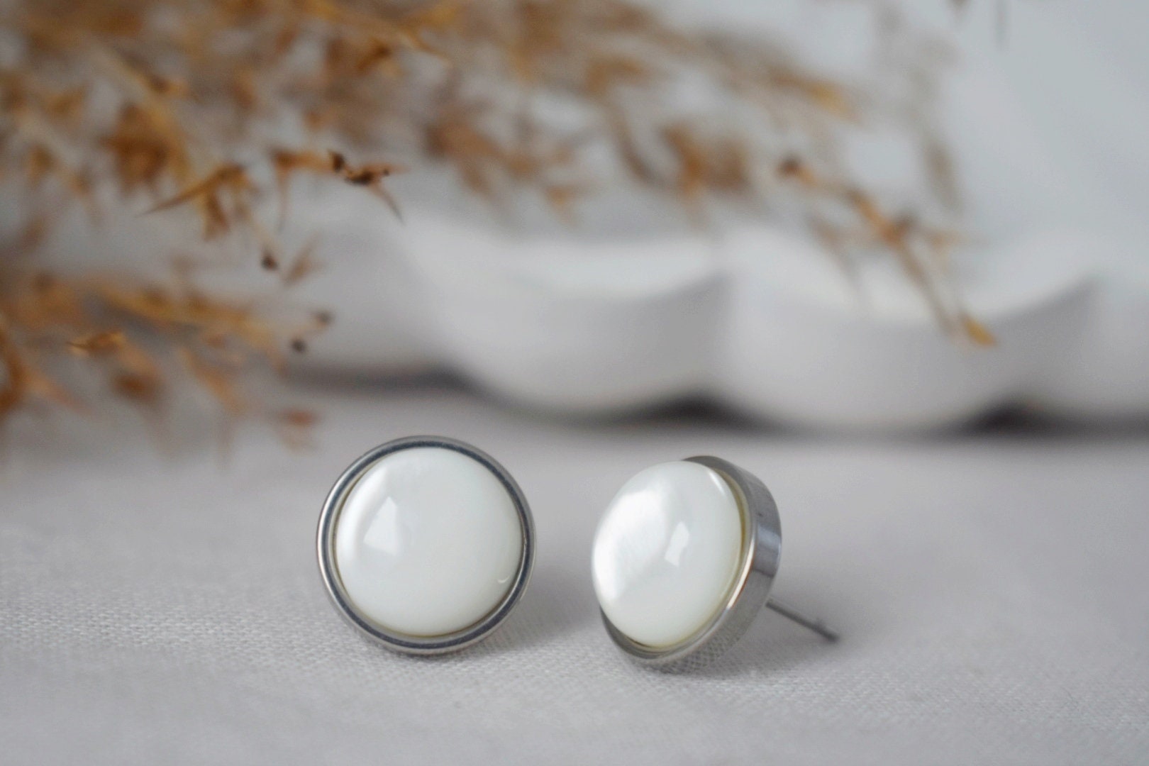 Mother of pearl stud ears, Shell stud ears, 10mm, Stainless Steel stud ears, Round, Push back stud, Pearl jewelry, Gift for women