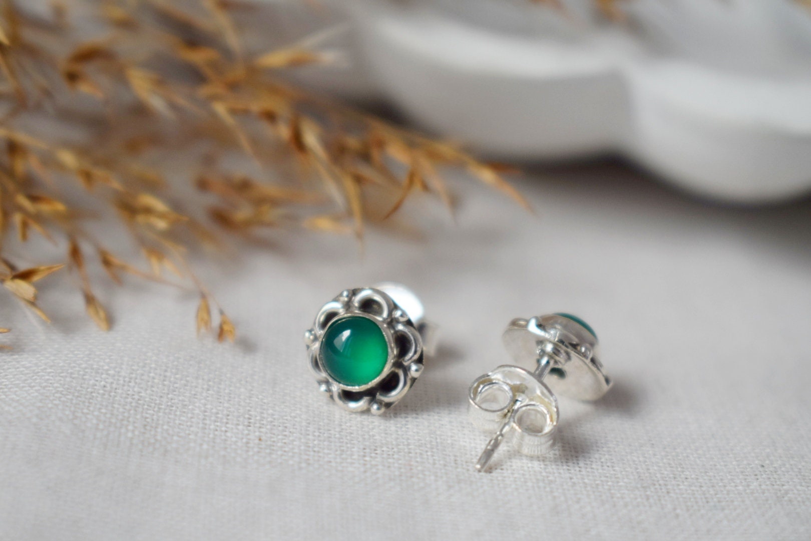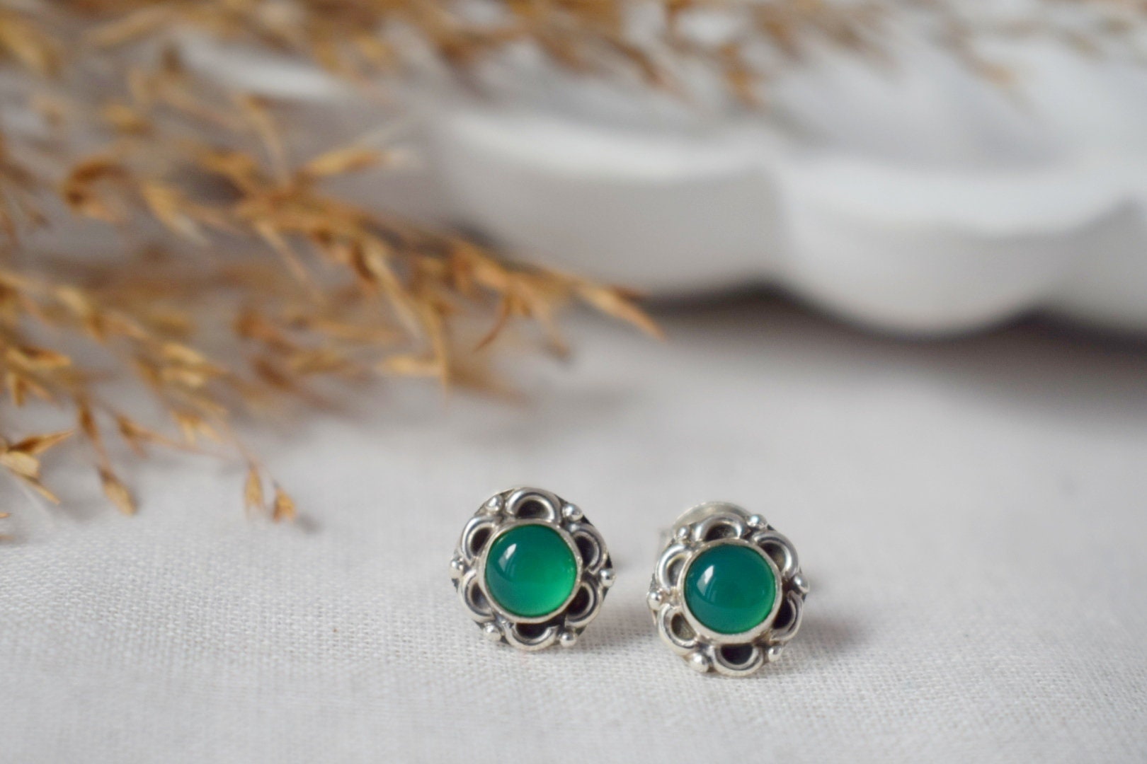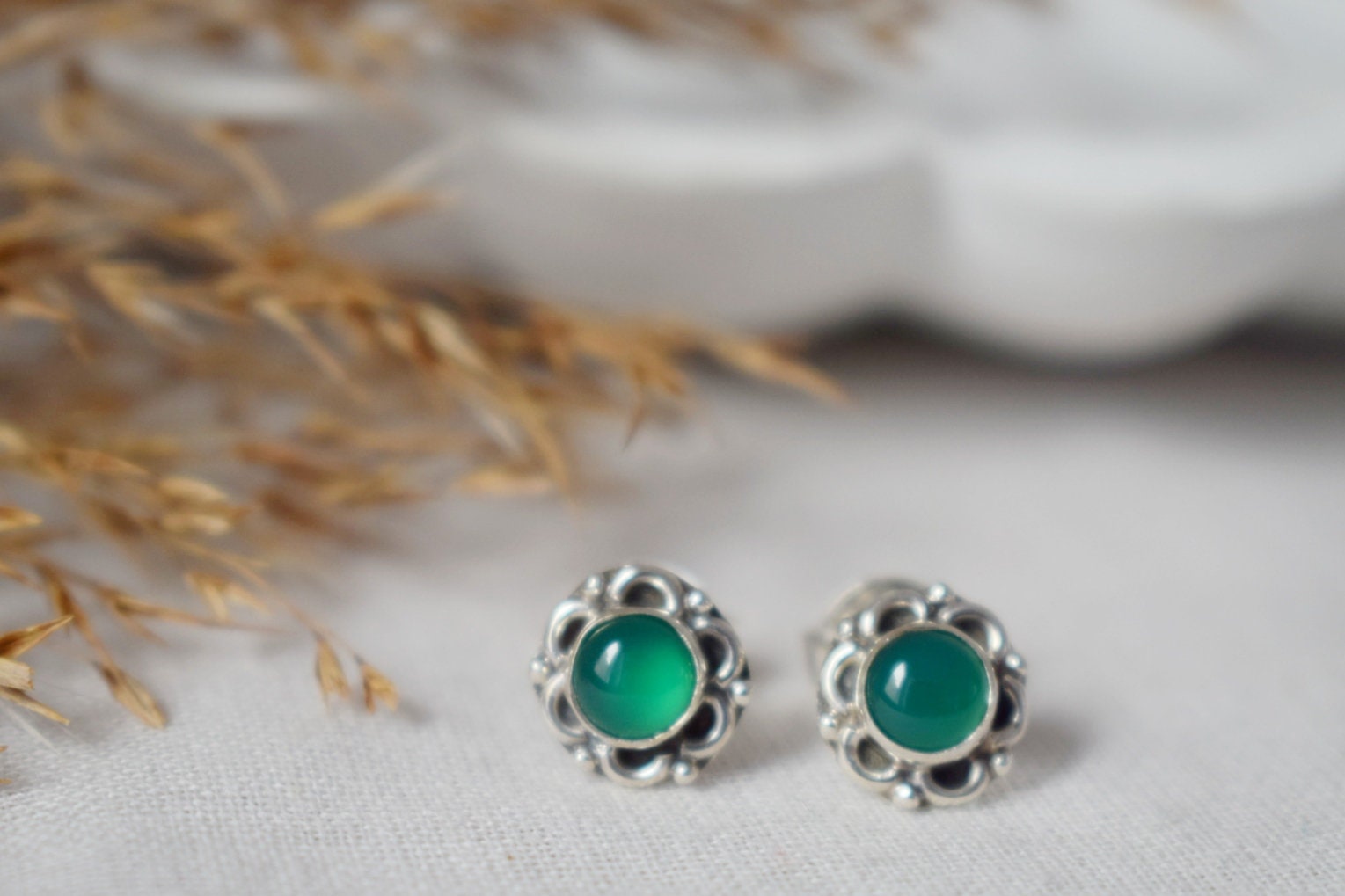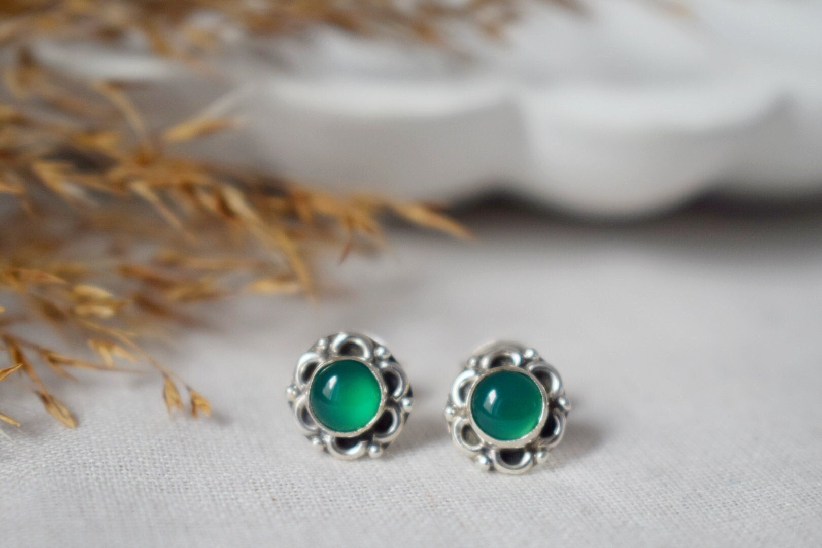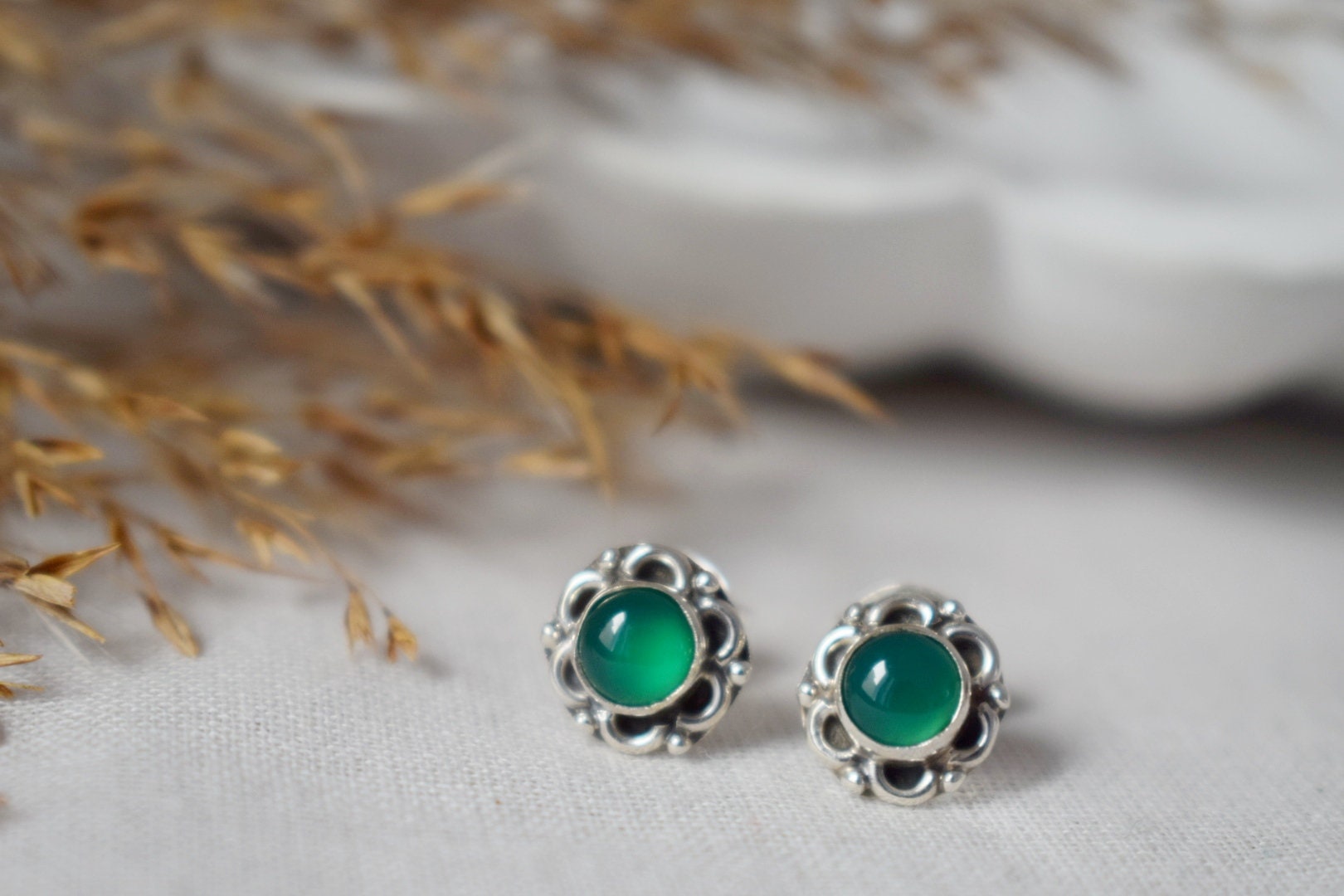 Christmas jewelry Gifts, Green Onyx Stud Earrings, Gemstone Sterling Silver Minimalist Jewelry, Flower Small Birthstone Push Back Earrings