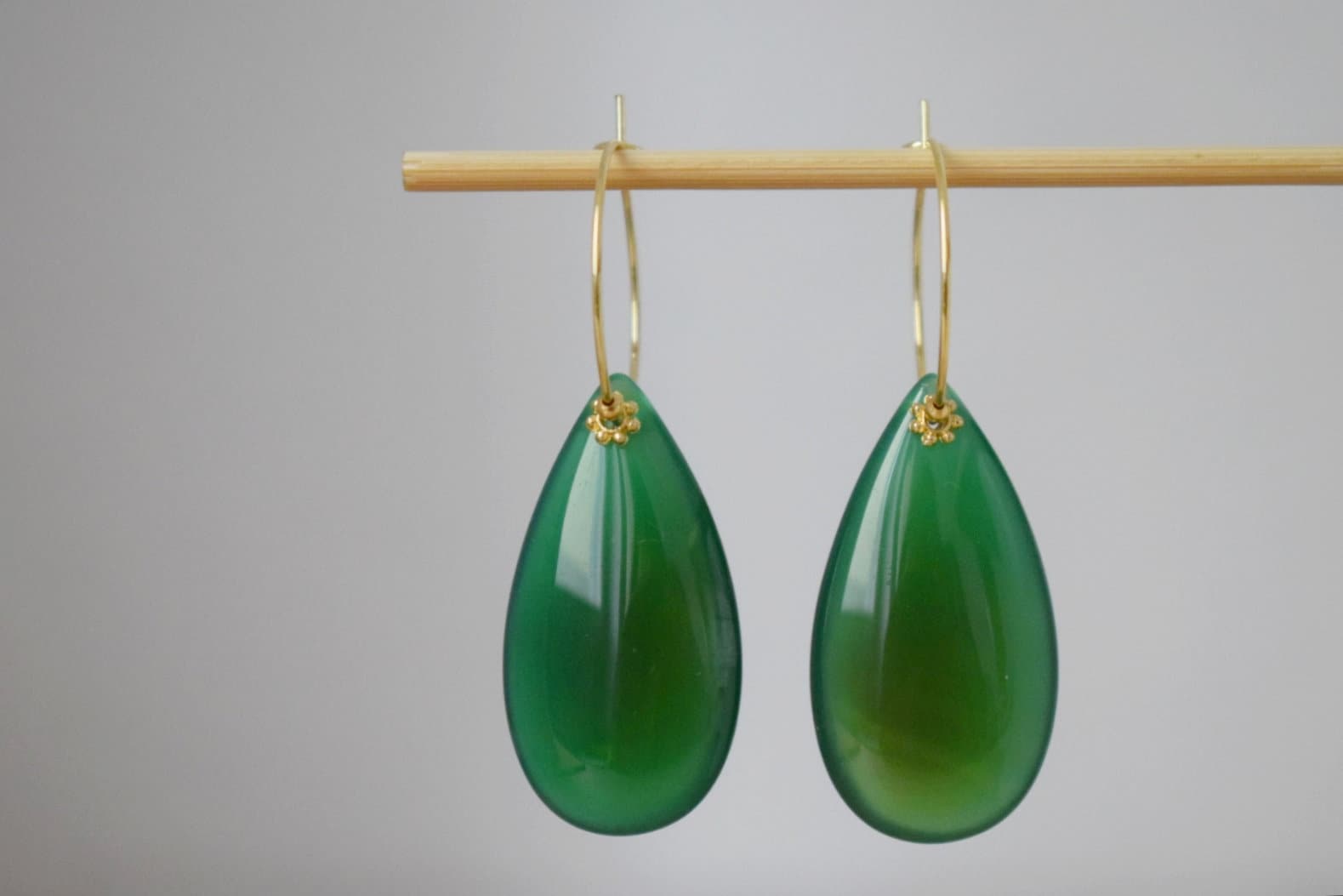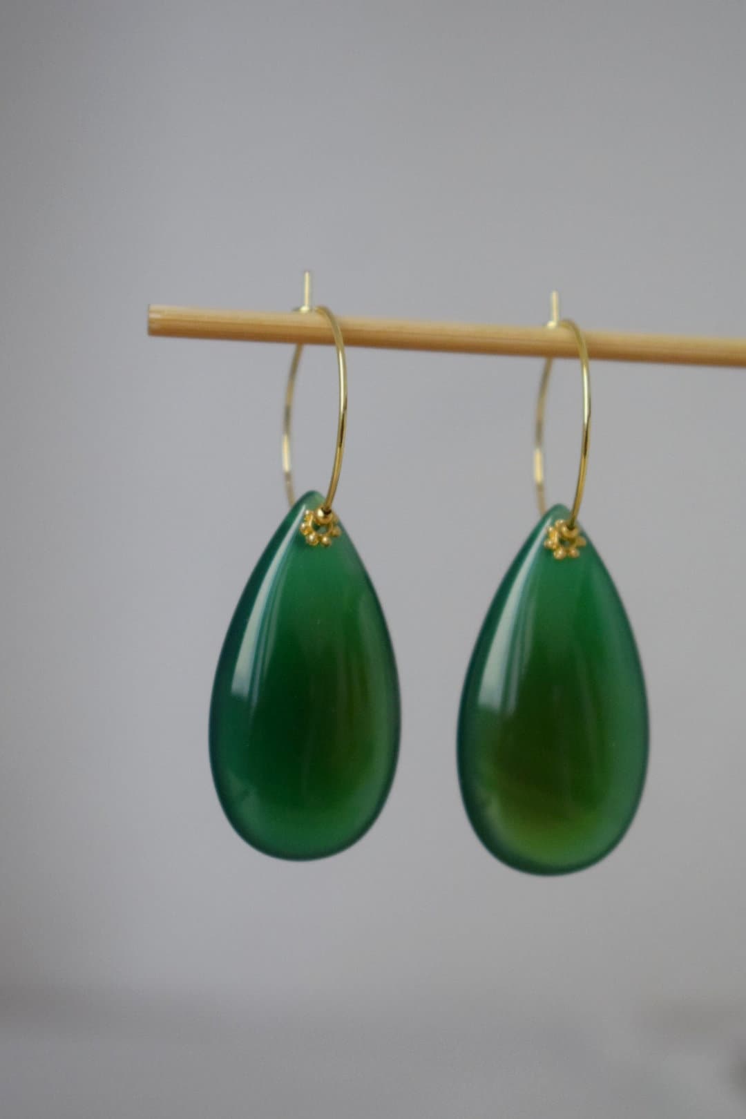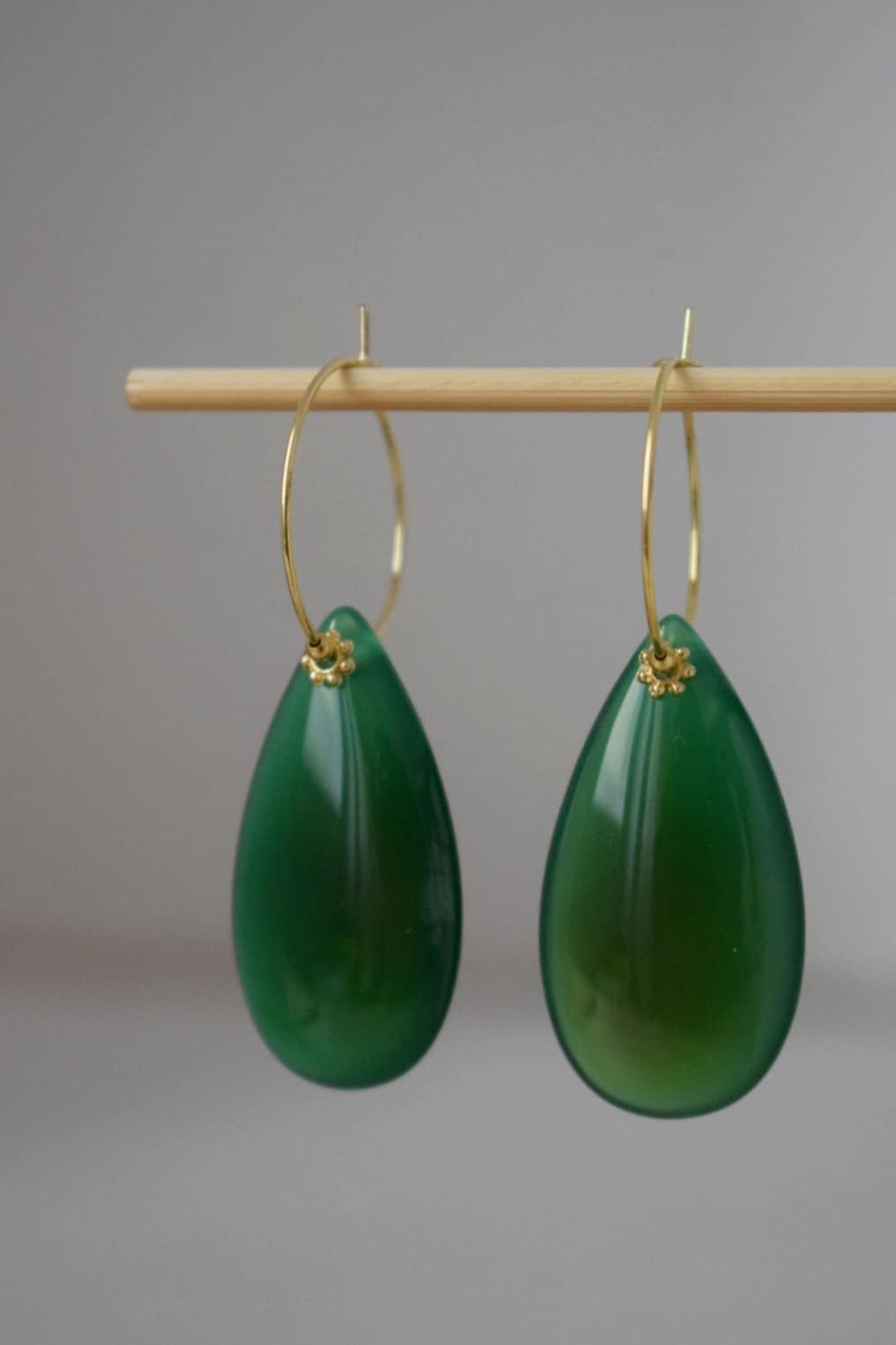 Natural green agate hoop ears 18k gold plated stainless steel, Long teardrop gemstone ears, Handmade jewelry gift