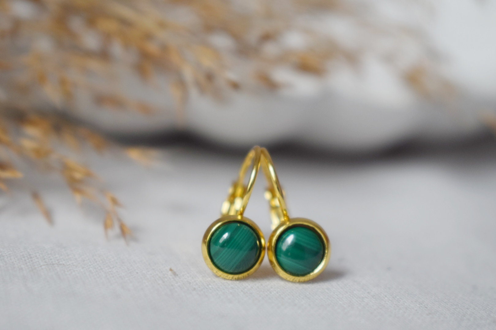 Natural Malachite Earrings Gold, 10mm Dangle Earrings, Small, Minimalist, Green Gemstone, Lever back, Malachite Jewelry, Birthstone Earrings