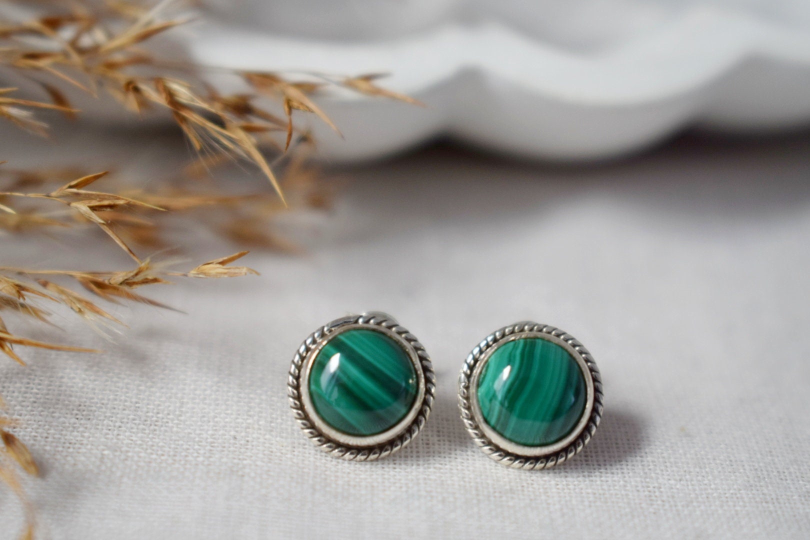 Natural Malachite Stud Earrings, 925 Sterling Silver Ornament Studs, Round Green Gemstone, Birthstone Jewelry, Handmade Gift for Her