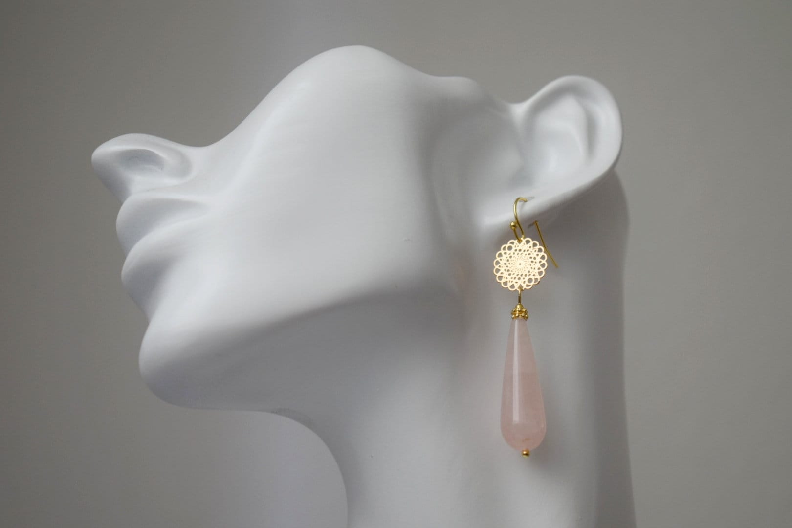 Natural Rose quartz dangle ears gold, Long teardrop ears, Mandala, Gemstone drop ears, Wedding ears, Rose quartz jewelry