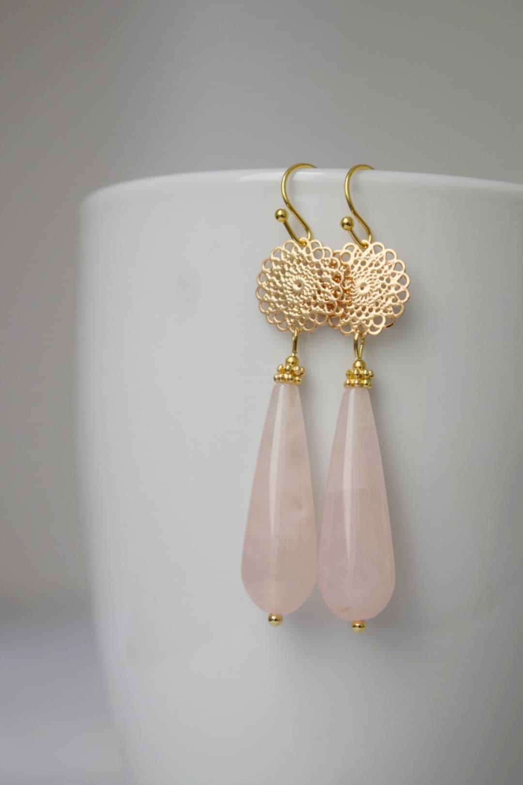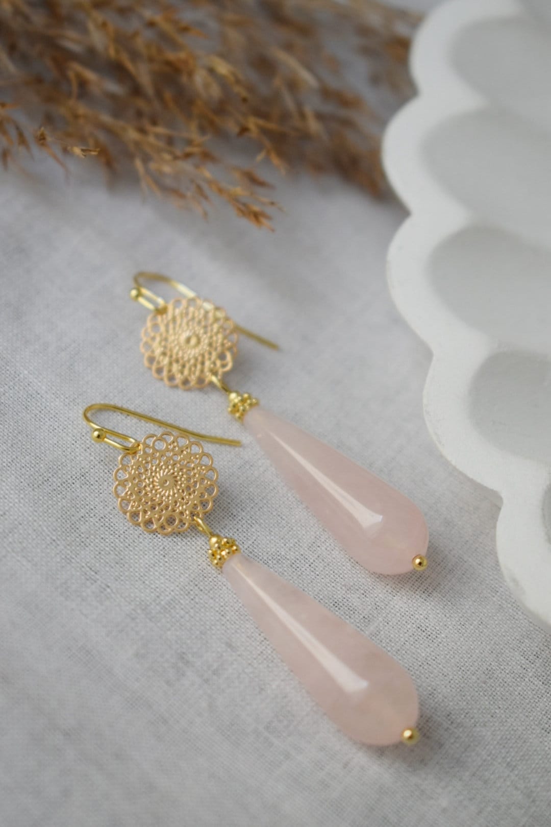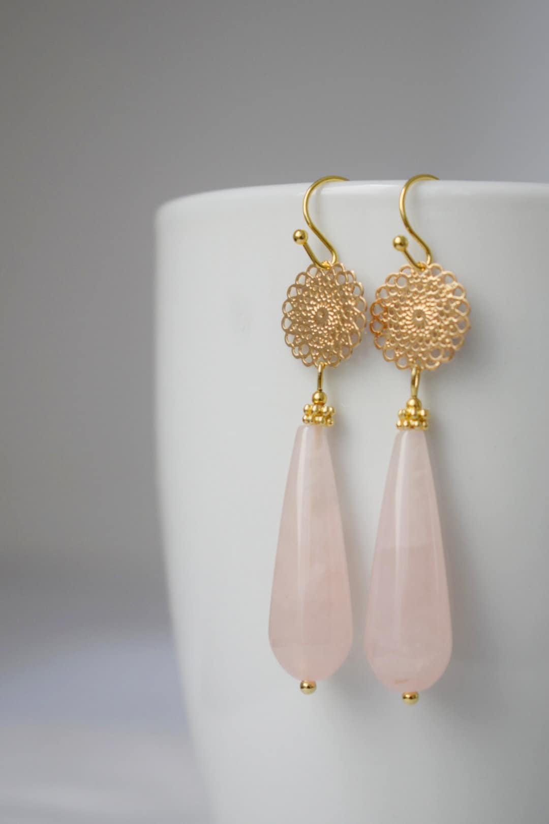 Natural Rose quartz dangle earrings gold, Long teardrop earrings, Mandala, Gemstone drop earrings, Wedding earrings, Rose quartz jewelry
