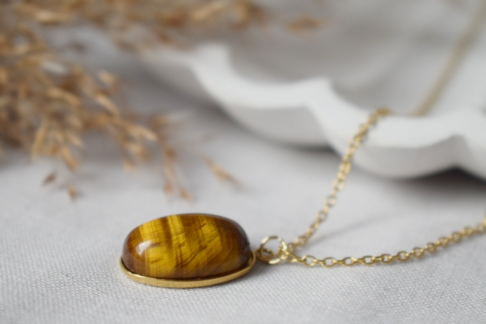 Necklace Oval Tiger Eye Gemstone Pendant, Tigers Eye Gold Plated Stainless Steel Jewelry, Long Brown Gold Birthstone, Christmas Gift For Her