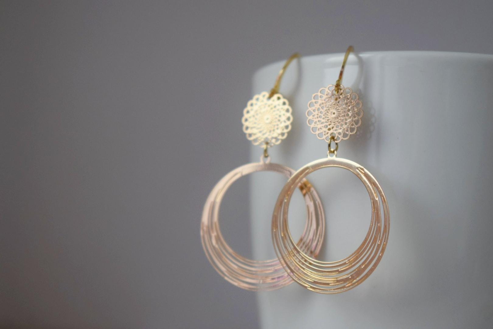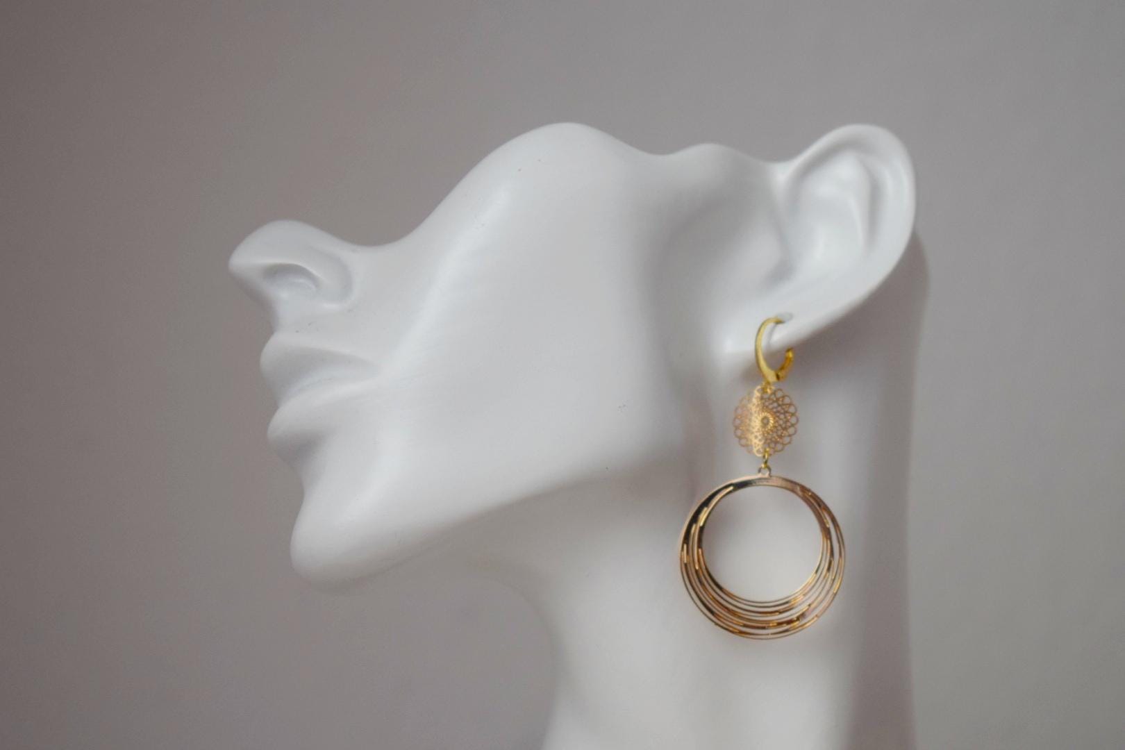 Ornament earrings for women, Mandala earrings, 24k gold plated stainless steel huggie, Boho filigree hoops, Unique jewelry, Gift for her