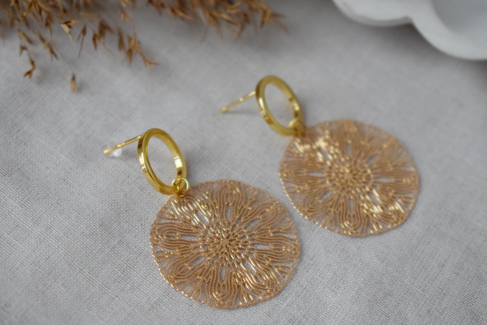 Ornament earrings for women, Mandala gold stud earrings, Boho filigree earrings, Open circle studs, Jewelry gift for her