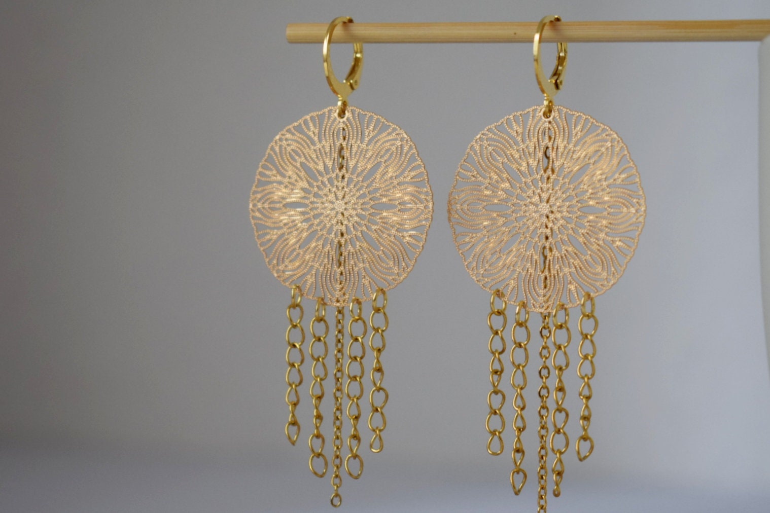 Ornament earrings for women, Mandala golden huggies, Stainless steel chain earrings, Long Boho filigree earrings, Mandala jewelry gift her