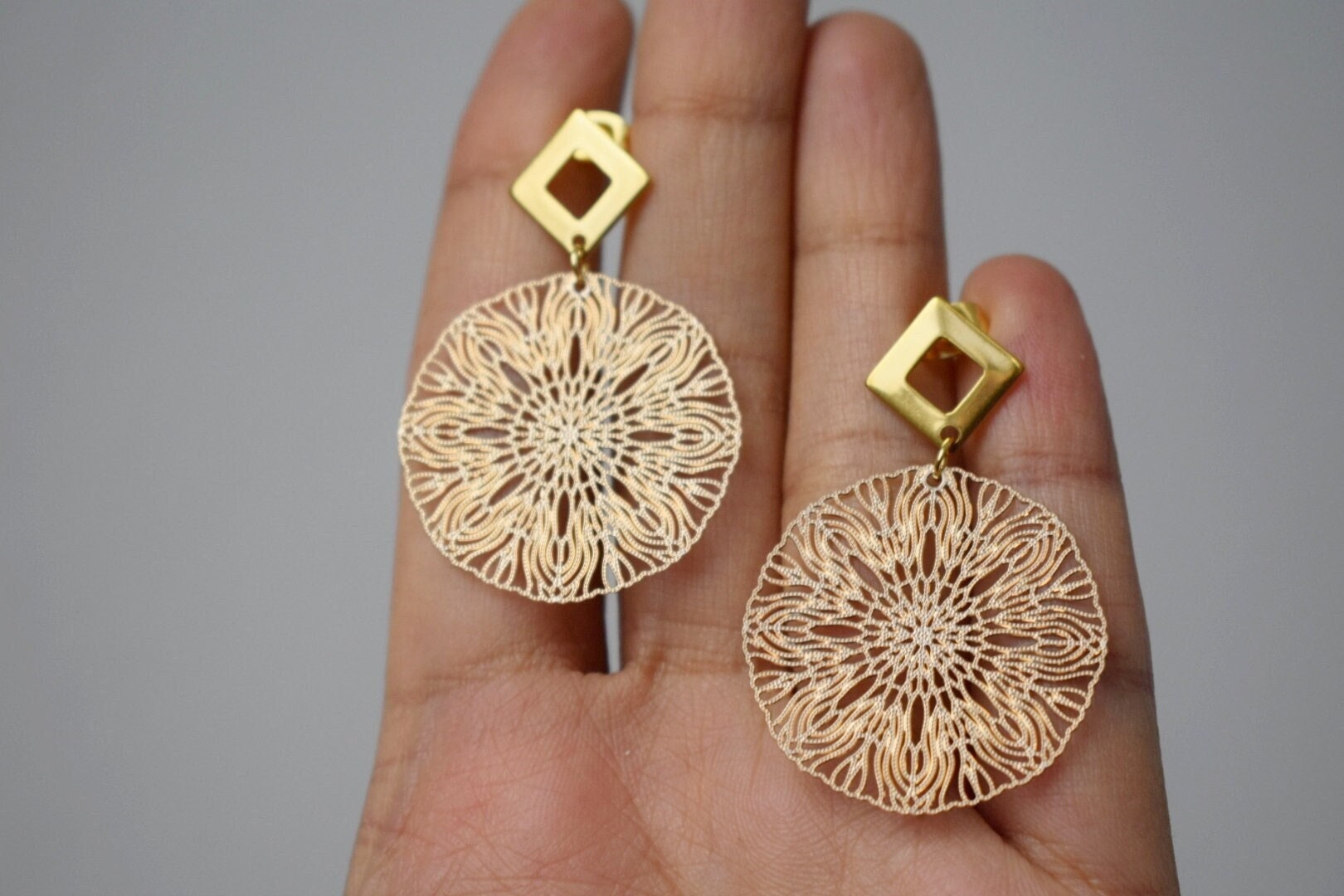 Ornament earrings for women, Mandala stud earrings, Rhombus studs, Gold plated stainless steel studs, Boho filigree earrings, Jewelry gift