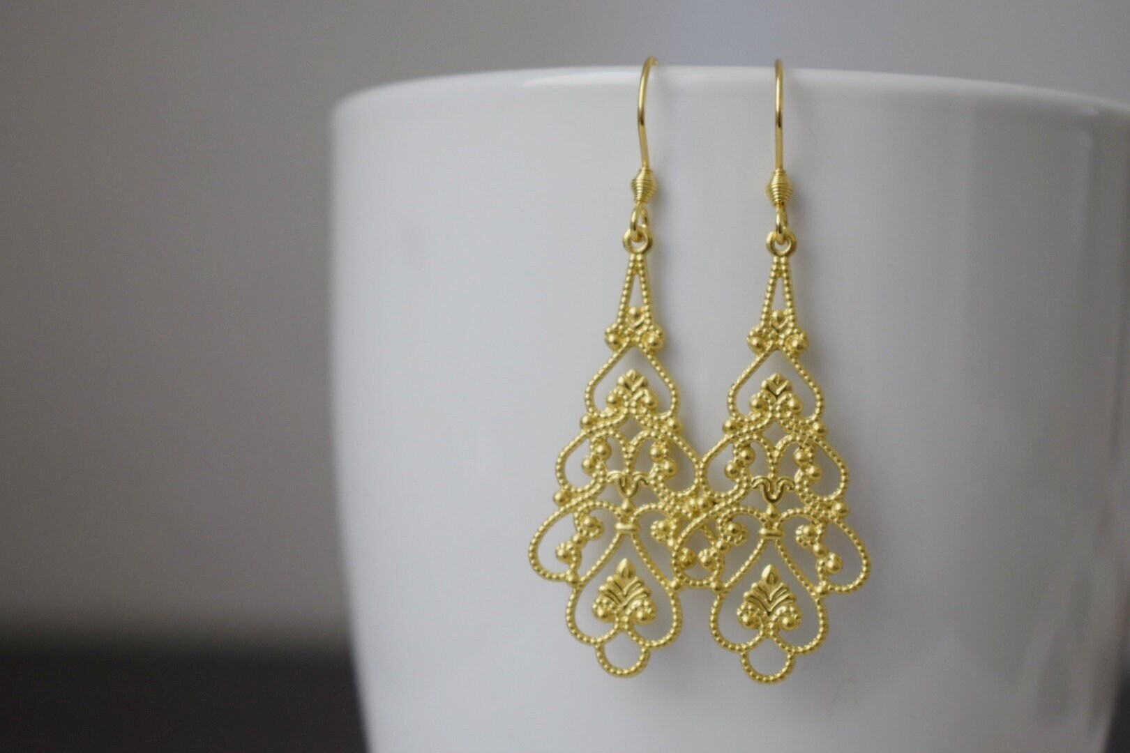 Ornament earrings gold, Long filigree & floral earrings, Vintage, Boho, Stainless steel, Teardrop earrings, Unique, Handmade jewelry gift